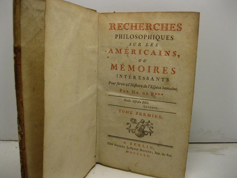 Recherches philosophiques sur les Americains ou Memoires interessants pour servir a' l'histoire de l'espece humaine par Mr. de P.