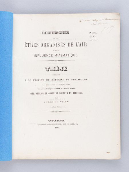 Recherches sur les Etres inorganisés de l'Air et leur influence miasmatique [ Edition originale - Livre dédicacé par l'auteur ] Thèse présentée à la Faculté de médecine de Strasbourg et soutenue publiquement le 15 janvier 1868