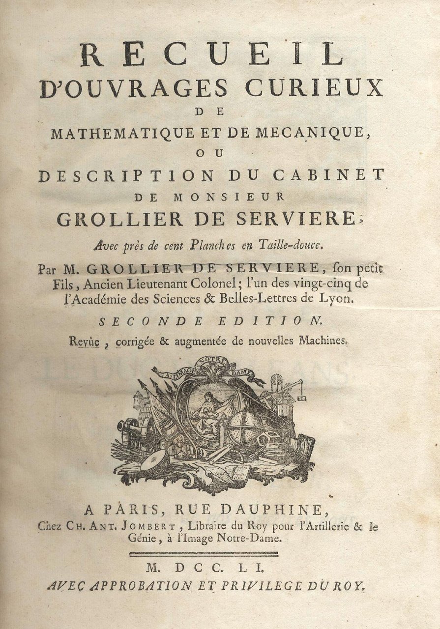 Recueil d'ouvrages curieux de mathématique et de mécanique, ou description du cabinet de Mr. Grollier de Serviere. Seconde édition revue, corrigée et augmentée de nouvelles machines.