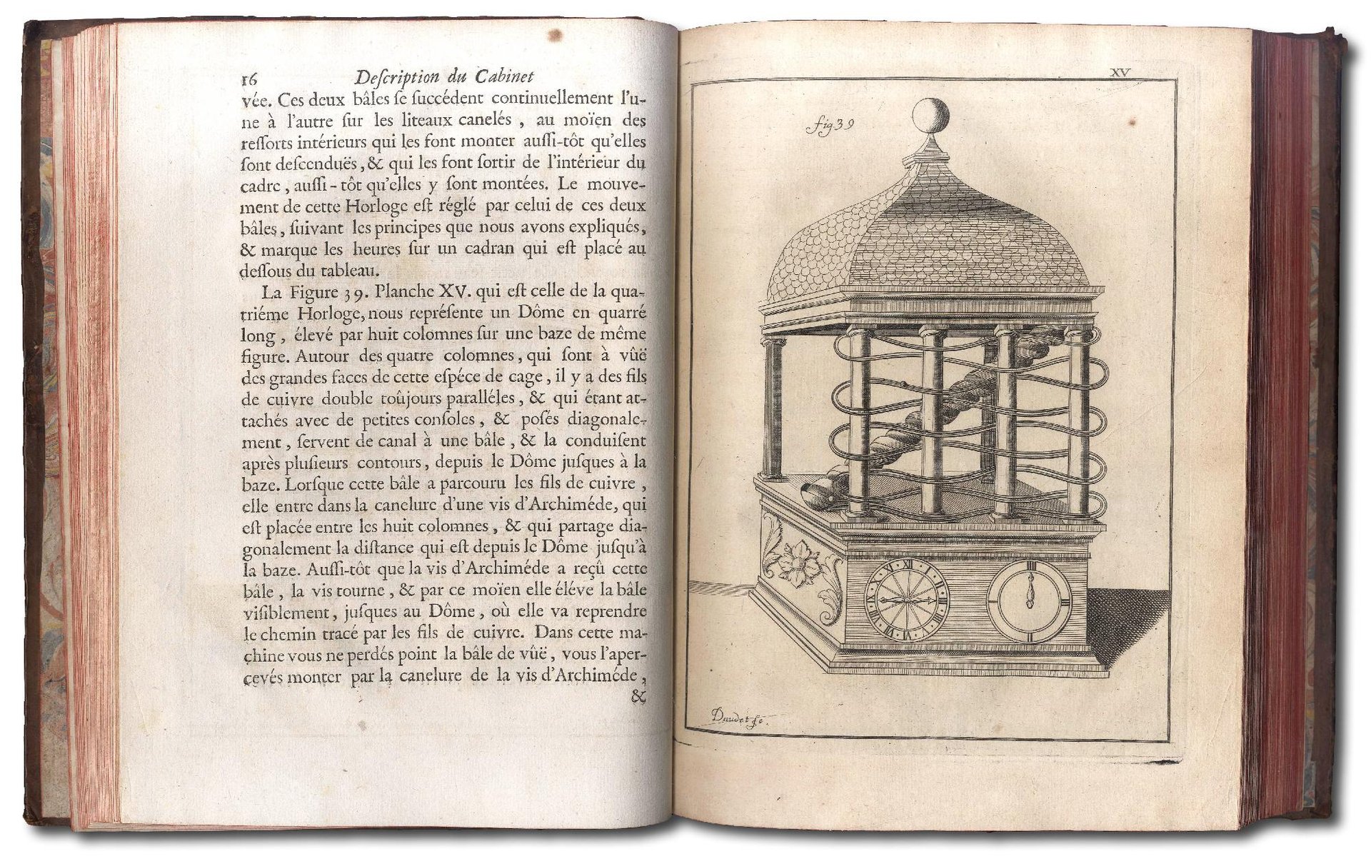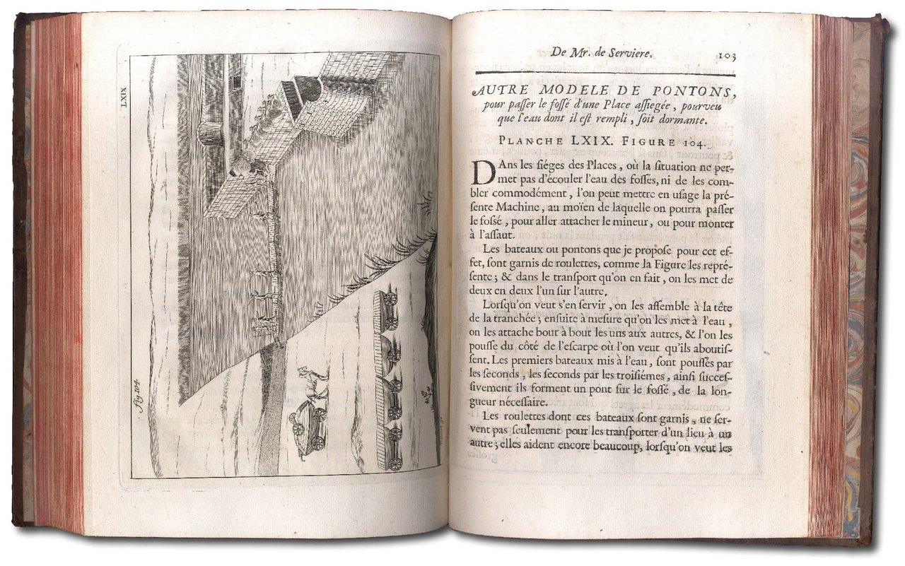 >in-4 (250x185 mm), pp. (24), 152, (8), leg. del tempo p. pelle marmorizz., dorso a nervi con tit. e fregi oro, tagli rossi (difetti alla cuffia super. e ad uno spigolo). Con 93 belle tav. inc. in rame f.t. (num. I-LXXXVIII, ma le tav. 39, 48 e 76 non sono apparse in origine, come avverte apposita nota rispettivamente a pag. 58, 70 e 113; invece le tav. 31, 52, 56 e 72 sono doppie e la n. 84 è quadrupla) raffiguranti per lo più macchine da guerra, sia d'attacco che difesa, idrauliche, per costruire ponti, mulini ad acqua, a vento ed a braccia, ed una serie di orologi di forma varia e curiosa (v. pp. 13-33 e tav. XIII-XXI). Seconda edizione (la prima era apparsa nel 1719, con sole 85 tavole) di opera famosa concernente la scienza e la tecnica, soprattutto le macchine curiose, importante e rara; in essa l'autore (1677-1745, discendente della famiglia del celebre bibliofilo e legatore Jean Grolier) descrive quegli straordinari macchinari che il nonno aveva raccolto nel proprio gabinetto a Lyon. Dedica al Duca d'Orléans, preceduta da elegante testatina con stemma ed iniz. inc. Ottimo esemplare. Olschki, Choix, I, 1605 e Berlin Kat. n.1784 (per la I ediz.). Wheeler Gift 369.