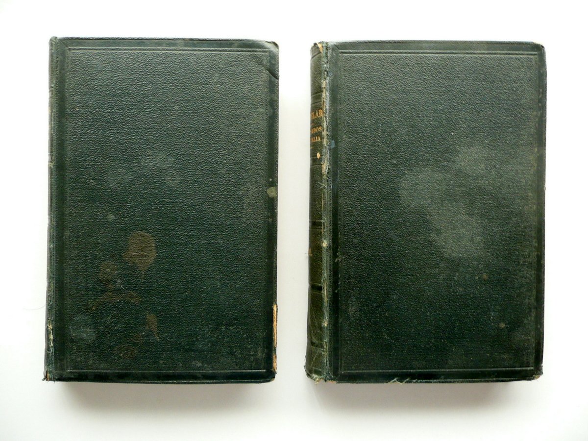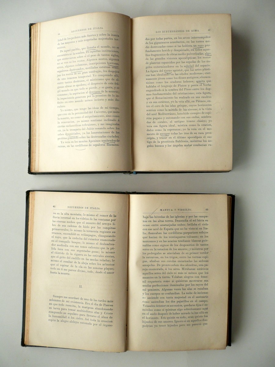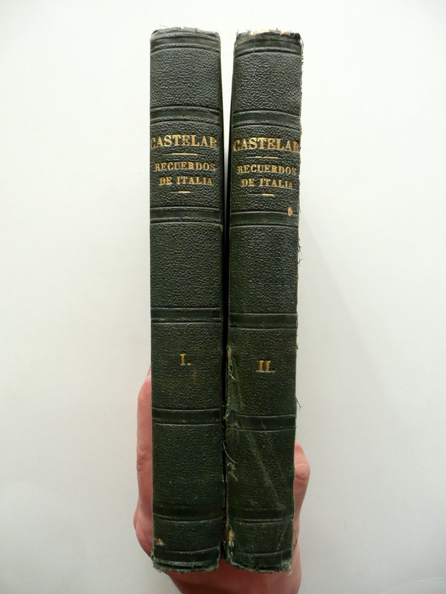 Emilio Castelar, Recuerdos de Italia Tercera edicion A. de Carlos e Hijo, Madrid 1876, cm 21x14, pp. I-VIII; pp. 1-394 (volume I); pp. I-XVI; pp. 1-396 (volume II); legatura in tutta tela con titolo impresso in oro al dorso. Retro di entrambi i frontespizi con nome del precedente proprietario annotato a penna. Opera completa in due volumi. Testo in spagnolo. Condizioni di conservazione Volumi entrambi in buone condizioni con tracce d'uso; coperte con alcuni leggeri aloni; margini, angoli dei piatti e cerniere con qualche strappetto e alcune circoscritte mancanze (vedi foto). Interni buoni con alcune piccole lievi bruniture; alcune pagine con sottolineature e/o annotazioni a matita (sono presenti anche poche brevi annotazioni a penna); angolo inf. di poche pagine con una leggera traccia di piccola pieghetta. Opera completa in due volumi. Testo in spagnolo. SETT96.L8936 N