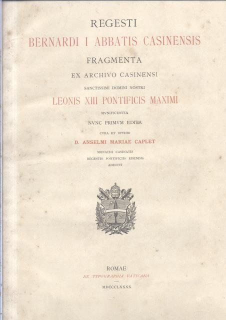 REGESTI BERNARDI I ABBATIS CASINENSIS. Fragmenta ex Archivo Casinensi, Sanctissimi Domini Nostri Leonis XIII Pontificis Maximi munificentia nunc primum edita. Regestiis Pontificiis edendis addicti.