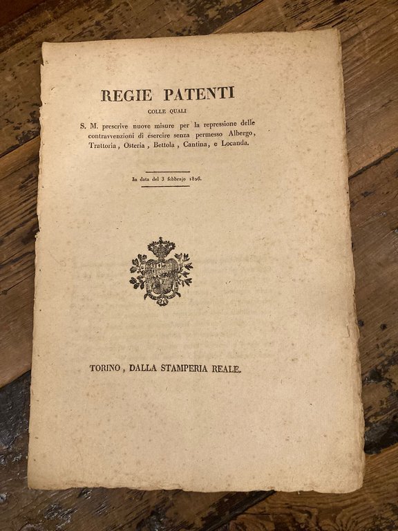 Regie patenti colle quali Sua Maestà prescrive nuove misure per la repressione delle contravvenzioni di esercire senza permesso Albergo, Trattoria, Osteria, Bettola, Cantina e Locanda