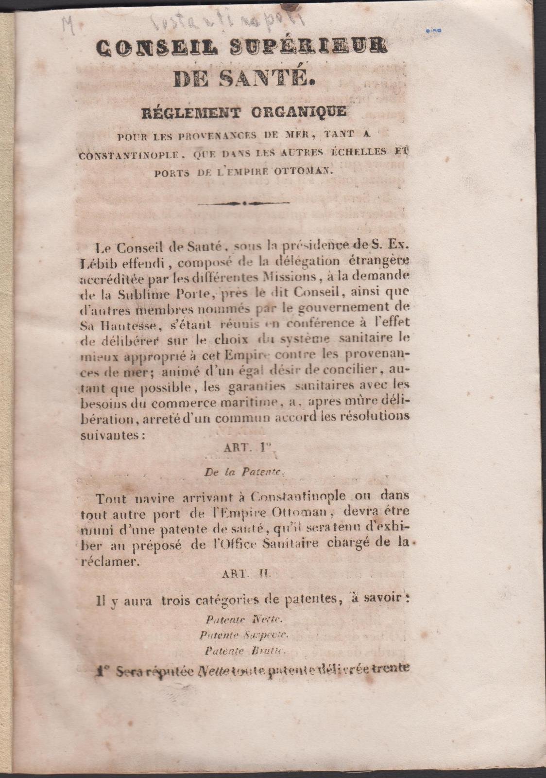 Regolamentazione organica per le provenienze del mare sia a Costantinople che per altri porti 1841 colera