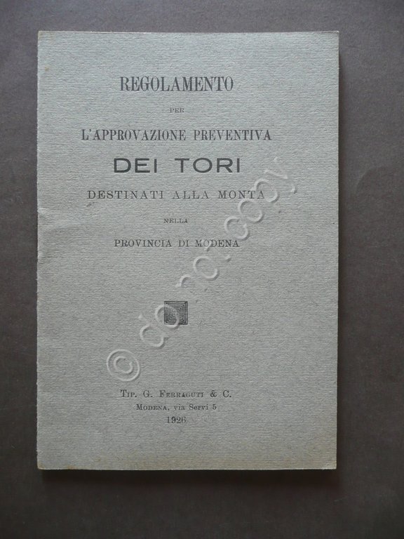 Opuscolo, Regolamento per l'approvazione preventiva dei Tori destinati alla monta nella Provincia di Modena Tip. G. Ferraguti & C., Modena, 1926; 16,5x11,3 cm.; pp. 18, br. ed. Condizioni di conservazione Esemplare in buonissime condizioni, leggere ingialliture ai margini dei piatti, minime pieghette d'uso agli angoli interni molto buoni, freschi. SC03.D4530 N