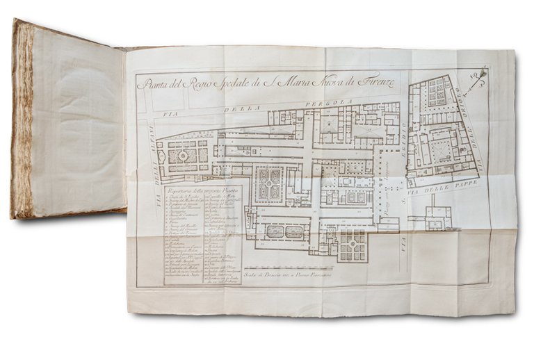 >in-4, pp. XIV, 313, 27 tabelle e spiegazioni a stampa, 4 grandi tavole incise e ripiegate f.t. Legatura originale cartonato rustico. Dedicato dal Covoni, commissario dello Spedale, a Pietro Leopoldo Granduca di Toscana. Completa descrizione della nota istituzione fiorentina, sua organizzazione e funzioni dell'organico. Bell'esemplare su carta forte, con barbe (lieve alone ai primi fogli).