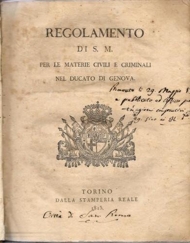 Regolamento di S. M. per le materie civili e criminali nel Ducato di Genova, 2 parti in 1 volume