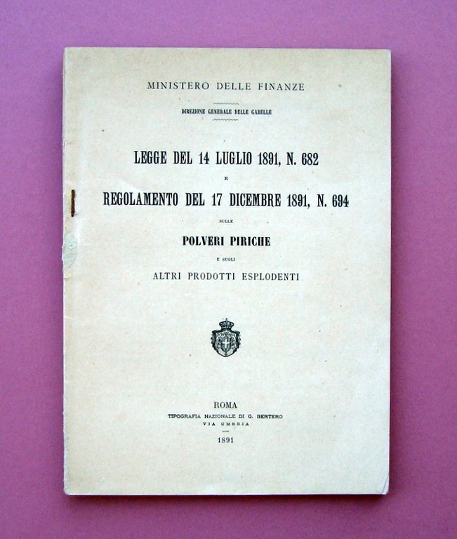 Brossura, Legge del 14 Luglio 1891, N. 682 Regolamento del 17 Dicembre 1891, N. 694 Polveri Piriche Altri Prodotti Esplodenti Tip. Nazionale di G. Bertero, Roma, 1891, cm. 22x16; pp. 78; br.ed. Condizioni di conservazione Buone condizioni con tracce del tempo; qualche leggerissima abrasione e leggere bruniture; dorso mancante ma esemplare compatto, spillatura metallica; alcune pagine con evidenziazioni laterali(vedi foto). SETT57.L20562 BLU P