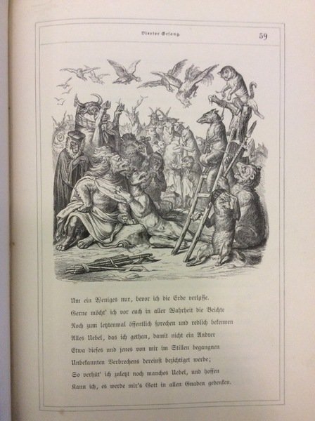 In-8 gr. (mm. 267x178), bella legatura editoriale in tela verde, ricchissima decoraz. in oro al piatto e al dorso, pp. (4),204, testo entro doppio filetto; molto ben illustrato da numerosi disegni dell'artista Wilhelm von Kaulbach; ornato da testate figurate, grandi capilettera e finali, il tutto inc. su legno. Rifacimento in esametri dell'antico poema epico tedesco Reinke de vos che narra le avventure della volpe Renard.Risg. anter. con piccola manc.; p. 185 priva dell'ang. super., qualche lieve fiorit. margin. ma certamente un buon esemplare.
