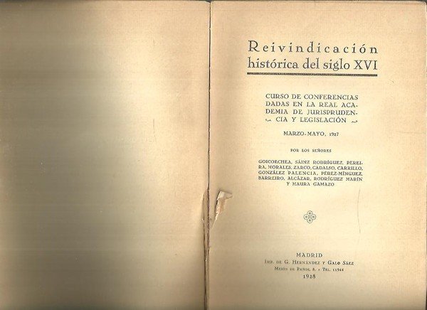 REIVINDICACION HISTORICA DEL SIGLO XVI. CURSO DE CONFERENCIAS DADAS EN LA REAL ACADEMIA DE JURISPRUDENCIA Y LEGISLACION.