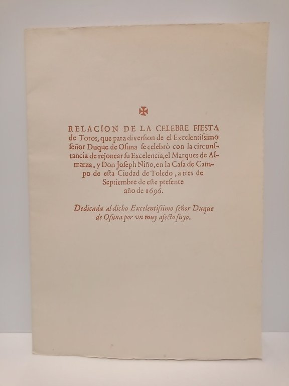 Relacion de la celebre Fiesta de Toros, que para diversion de el Excelentisimo señor Duque de Osuna se celebrò con la circunstancia de rejonear su Excelencia, el Marques de Almarza, y Don Joseph Niño, en la Casa de Campo de esta Ciudad de Toledo, a tres de Septiembre de este presente año de 1696