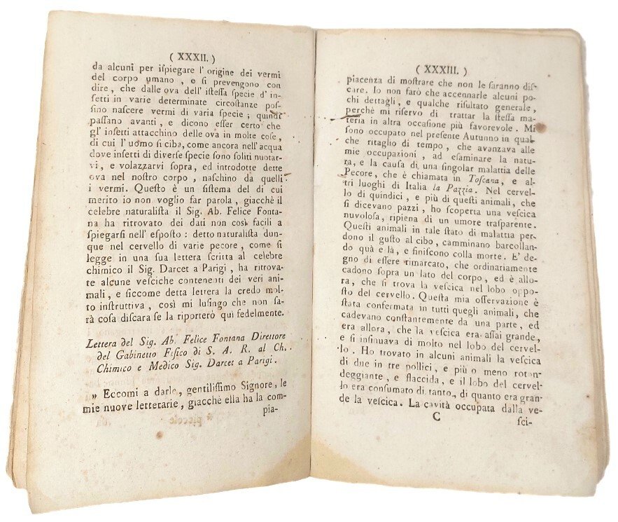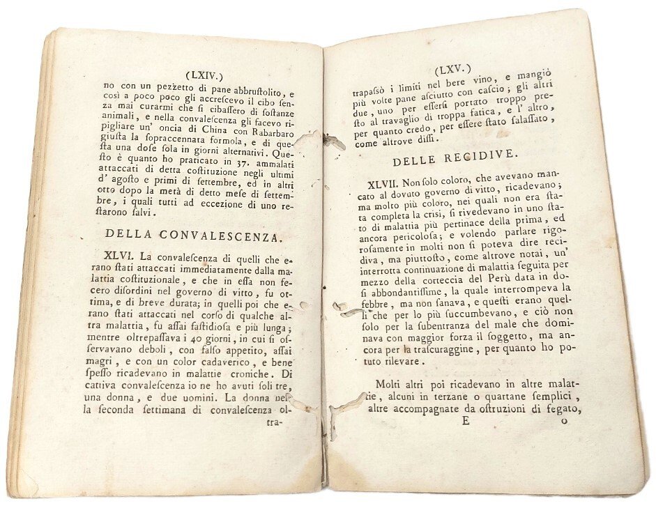 >in-8 (197x122 mm), pp. LXXXII; cartonato coevo marmorizzato. "Cominciavano gli attaccati di costituzione con stitichezza di ventre ed inappetenza, indi a qualche giorno con rigori di freddo lungo la spina...gli ammalati cadevano in un abbatimento d'animo con nausea, e tendenza al vomito; accusavano alcuni del grande irritamento al ventricolo...quasi tutti hanno o per vomito o per secesso evacuato dei vermi molto rossi unitamente ad una bile viscida-poracea, ed in qualcuno caso tendente al nero..." L'opera si divide in capitoli: Della diagnosi; Delle cagioni in generale; Dei costumi; Dei prognostici in generale; Della cura; Della convalescenza; Delle recidive; Della cura delle recidiive; Dello sparo d'alcuni cadveri; Delle seppolture delle chiese; a pag. è riportata la "Lettera del Sig. Ab. Felice Fontana Direttore del Gabinetto Fisico di S.A.R. .." Interessante e rara monografia sull'epidemia "occorsa ne' mesi di giugno, luglio, agosto, e settembre del prossimo passato anno 1784 nella campagna di Sarzana e Valle di Magra", un solo esemplare censito dalla Biblioteca nazionale Vittorio Emanuele III (NA). Esemplare con alone al margine inferiore interno e numerosi lavori di tarlo che talvolta toccano il testo, soprattutto a partire da pag. XXXV.
