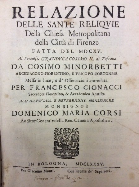 RELAZIONE DELLE SANTE RELIQUIE DELLA CHIESA METROPOLITANA DELLA CITTA' DI FIRENZE FATTA DEL MDCXV. - Al Sereniss. Granduca Cosimo II di Toscana. Messa in luce, e d'osservazioni corredata per Francesco Cionacci sacerdote fiorentino, & Accademico Apatista.