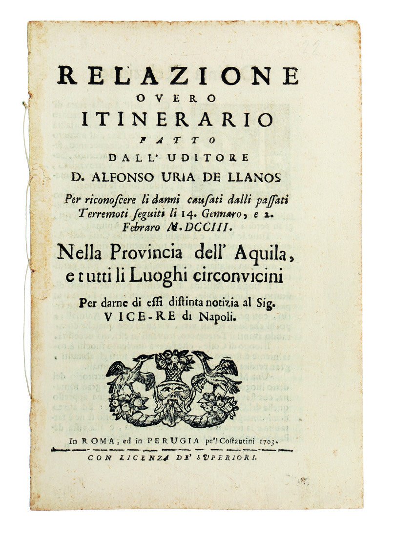>Small 4° (204x133 mm). [2] ll. One 10-line animated initial on verso of the first leaf. Unbound. A very good copy. Very rare official account written by the auditor Uria Llanos in behalf of the Vice-King of Naples, of the seismic sequence that on 14 January and 2 February stroke L’Aquila district. The report describes in detail the geological effects of the earthquake, giving a dramatic accounting of the damage and the number of victims. The disaster had a great echo in the news of that time, and Uria Llanos’ writing, introduced by different titles, was also proposed by other printers. Unknown to Baratta. No copy in OCLC. F. Petrucci Nardelli, Calamità e paure nella stampa popolare romana e laziale (1585-1721), “Archivio della Società Romana di Storia Patria”, 105 (1982), no. 56.