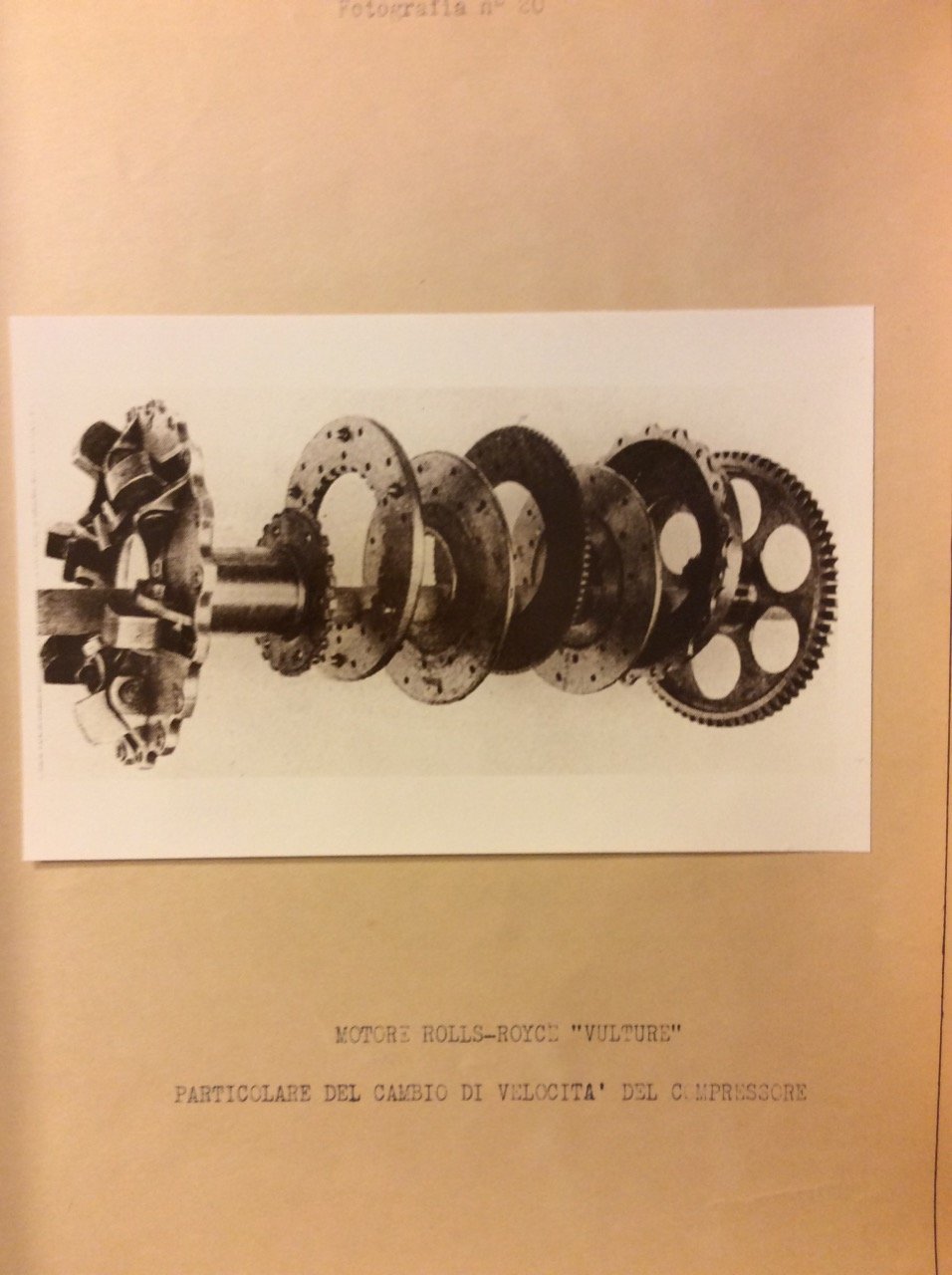 In-4 p., brossura orig. (dorso rinforzato in tela), 54 fogli dattiloscritti (al solo recto), corredati di complessive 43 figure, di cui 23 fotografie orig. applicate alla pag. Relazione fatta sulla prima mostra del materiale di preda bellica organizzata dal Ministero dell'Aeronautica Germanico relativa a motori inglesi, americani, russi e francesi e alcuni esemplari di motori germanici. La mostra è divisa in due sezioni: nella prima sono esposti i motori, per nazione. Di ciascun motore sono presentate le caratteristiche principali di potenza e d'ingombro. Per i motori di maggior interesse sono altresì esposti gli organi principali e messe in evidenza le particolari caratteristiche costruttive o di disegno. Nella seconda sezione sono presentate le varie parti dei motori per elementi: bielle, alberi, motori, basamenti, ecc.. Fogli ingialliti per la qualità della carta, altrimenti ben conservato.
