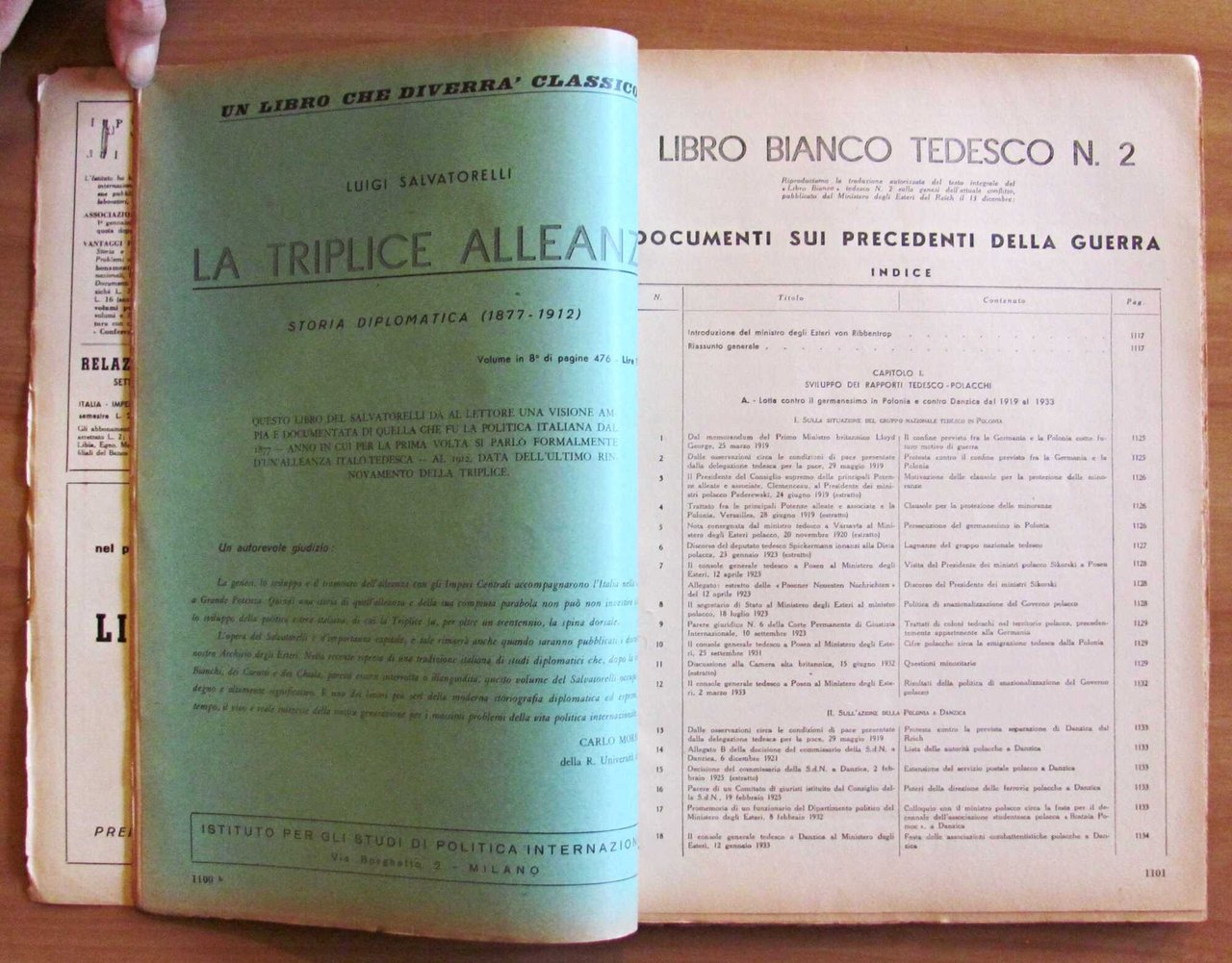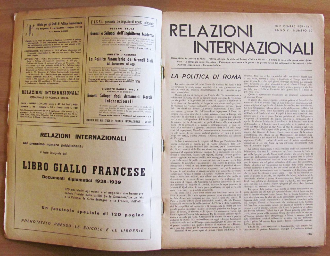 Relazioni internazionali. Settimanale di politica estera. Numero Speciale. 30 Dicembre 1939 - Anno V Numero 52. Sommario: La politica di Roma - Politica vaticana: la visita dei Sovrani d'Italia a Pio XII - La Svezia di fronte alla guerra russo-finlandese - La campagna russo-finlandese - L'economia americana e la guerra - Le perdite navali dei belligeranti e dei neutrali - Informazioni economiche - Documentazione. Istituto per gli Studi di Politica Internazionale - Milano, 1939. Brossura editoriale con lievissime barbe ai margini esterni del piatto e piccole mancanze al dorso. 24x34; pp. da 1085 a 1243. Buonissimo stato. , Molto buono (Very Good)