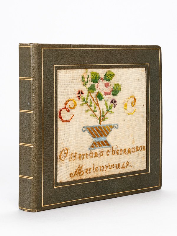 1 vol. in-8 oblong reliure postérieure plein chagrin vert réservant deux grandes fenêtres en plats dans lesquelles sont insérés deux broderies anciennes, aux initiales E. C. , avec un bouquet brodé et les textes respectifs suivants : "Offert à ma chère maman Mer le 13 7bre 1849" et "Offert à mon Cher Papa le 4 Août 1849 ". Le carnet contient 30 feuillets de papier vélin vierge. Très curieuse reliure "brodée", bien établie dans un style très particulier. Un vraie rareté.