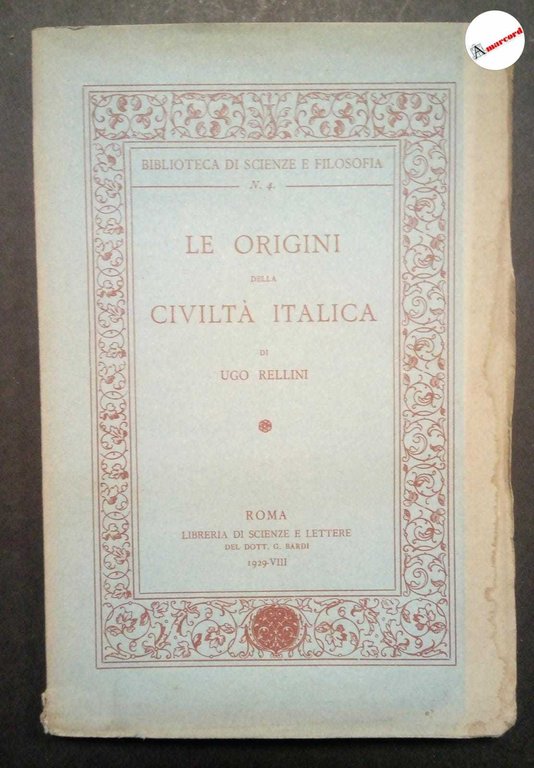 Rellini Ugo, Le origini della civiltà italica, Bardi, 1929, in-8, brossura editoriale, pp.112, illustrazioni f.t. a profusione, alcune tavole in fogli ripiegati.