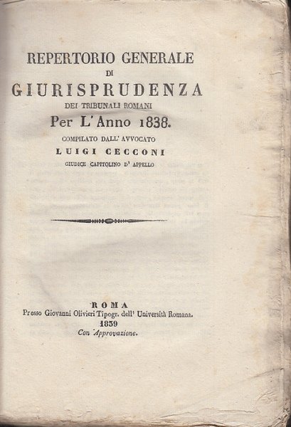 Repertorio Di Giurisprudenza Dei Tribunali Romani Per L'anno 1838 Compilato Dall'avvocato Luigi Cecconi Giudice Della Corte D'appello