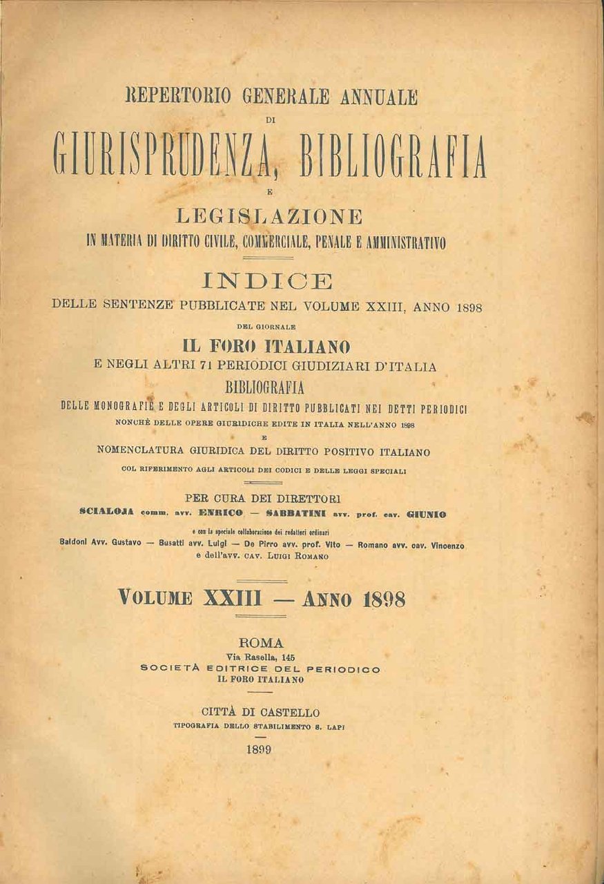 Repertorio generale annuale di giurisprudenza, bibliografia e legislazione. Volume XXIII, anno 1898 A cura di Scialoja e Sabbatini