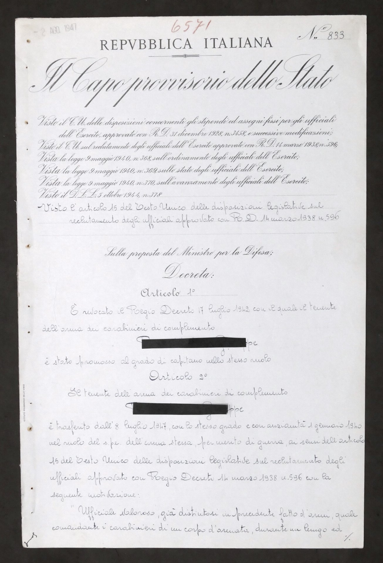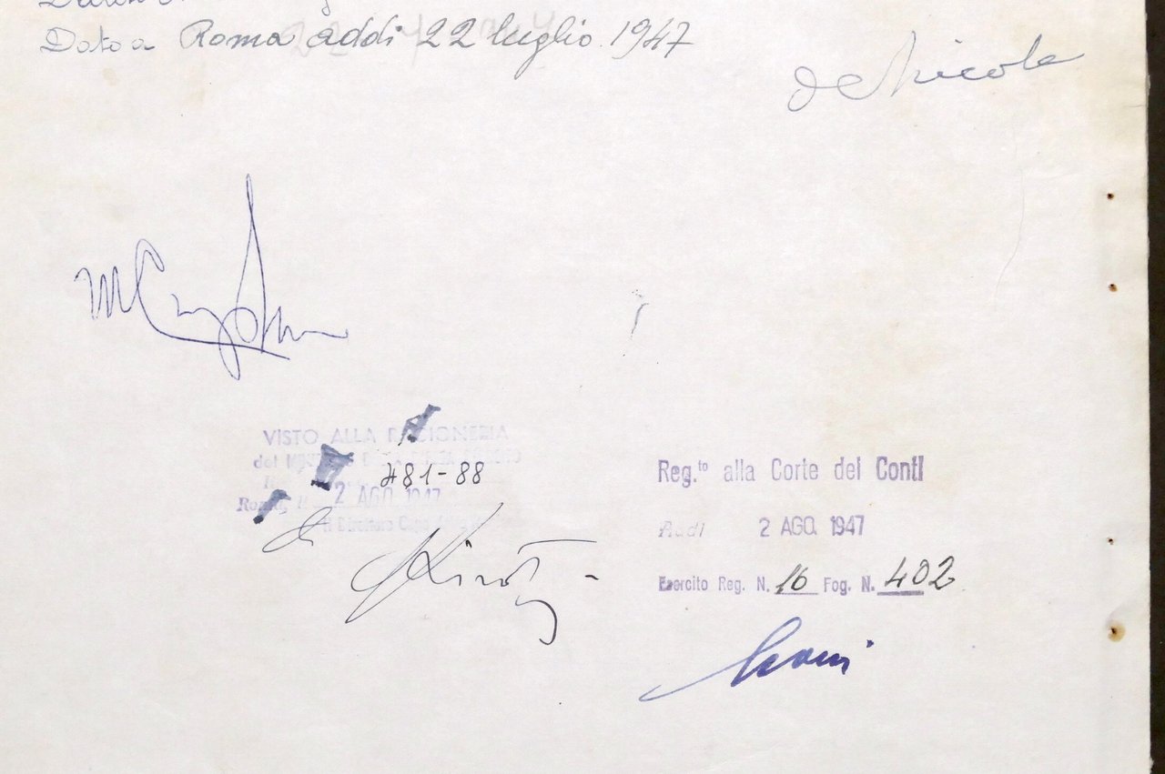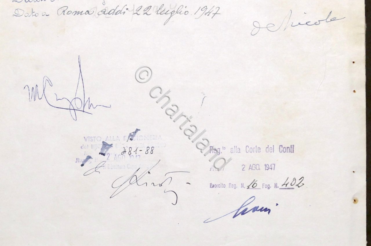 Repubblica Italiana - Decreto con autografo del capo provvisorio dello Stato - Enrico De Nicola Datato Roma, 22 Luglio 1947 Controfirmato dal ministro della Difesa Mario Cingolani Dimensioni: 24 x 37 cm ca. Oggetto: promozione al grado di capitano nell'arma dei Carabinieri Condizioni generali buone. Enrico De Nicola (Napoli, 9 novembre 1877 – Torre del Greco, 1º ottobre 1959) è stato un politico e avvocato italiano, primo presidente della Repubblica Italiana. Fu eletto capo provvisorio dello Stato dall'Assemblea Costituente il 28 giugno 1946 e ricoprì tale carica dal 1º luglio dello stesso anno al 31 dicembre 1947. Mario Cingolani (Roma, 2 agosto 1883 – Roma, 8 aprile 1971) è stato un politico italiano.