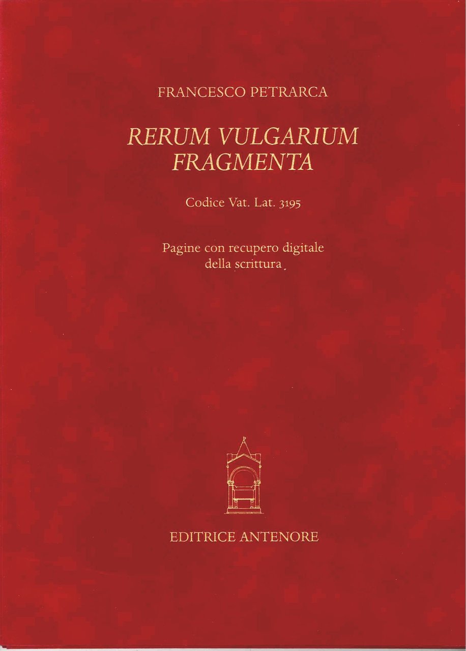 RERUM VULGARIUM FRAGMENTA : L'Autografo Del Canzoniere Di Francesco Petrarca Cod.Vat.Lat;3195 - pagine con recupero digitale della scritturaAntenore Editrice, Padova, 2003,� 2 voll., l'Autografo del Canzoniere Cod.Vat.Lat.3195.Padova /Citt�el Vaticano 2003 Antenore Editrice Un volume di 290 x 210 mm/circa di carte II-II-72-II ( = 4 + 4 + 144 +4 ) rilegato in velluto rosso con cordoni e tagli in oro,conforme all'originale,integrato da una cartella contenente 16 tavole di cui si offre un duplicato del facsimile,con recupero digitale di quelle pagine del codice che oggi appaiono pi� deperite o di minore leggibilit�+ un volume di commentario di Pagine 320 circa rilegato in piena tela. Tiratura mondiale di 499 esemplari numerati da 1 a 499, pi� 99 distinti con numeri romani -Il nostro �l n.67Il commentario, a cura di Gino Belloni,Furio Brugnolo,H.Wayne Storey e Stefano Zamponi,offre un'attenta ricostruzione della genesi e della storia del manufatto, una descrizione codicologica e paleografica, e infine una trascrizione diplomatico-interpretativa dei testi che potr�ostituire la futura edizione di riferimento delle rime del Petrarca.COPIA PERFETTA