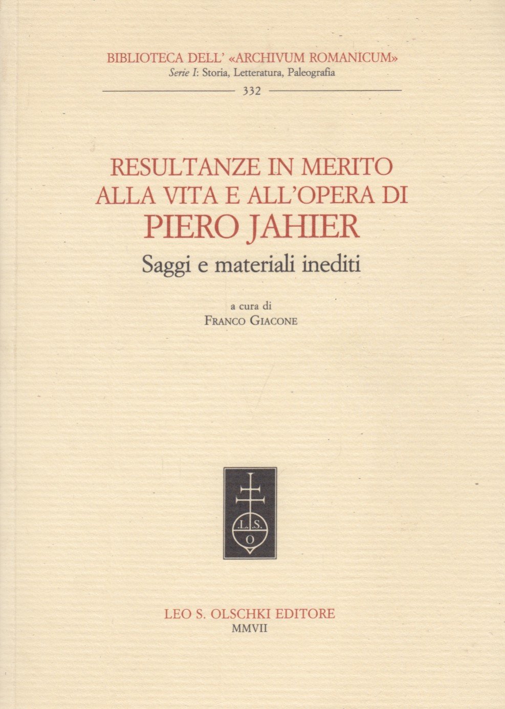 <p style="font-family:Verdana, Arial, Helvetica, sans-serif;font-size:11px;"><span style="font-size:18px;">Giacone Franco (A cura di): Resultanze in merito alla vita e all'opera di Pier Jahier. Saggi e materiali inediti. Leo S. Olschki Editore, 2007</span></p>