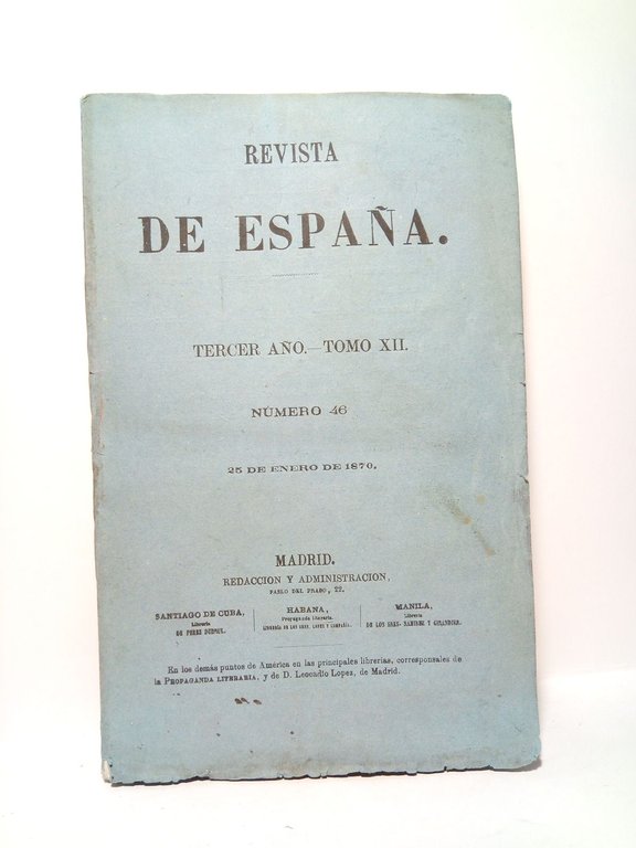 Madrid: Revista de España, 1870.- P. 161-320 (en total 156 pags.); 4º mayor (26 x 16,6 cm); Rustica Ed.- POSEEMOS EL SIGUIENTE NUMERO: Tercer Año, Tomo XII. Nº 46 de 25 de Enero de 1870. CONTIENE: Estudio sobre la emancipación de las colonias inglesas de su metrópoli, verificada en el siglo XVIII, por el Marqués de Miraflores; El Patrimonio Real desde 1808 a 1869 (conclusión), por D. F. Cos-Gayon; Lo que debe ser el Poder Judicial según la Constitución democrática de 1869, por D. Fortunato Caña; Indagaciones acerca de los Ducados de Atenas y Neopatria, en las Coronas de Aragón y Sicilia, por D. Plácido de Jove y Hevia.* POLÍTICA ESPAÑOLA DESDE 1833 A 1936