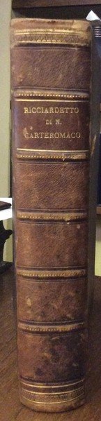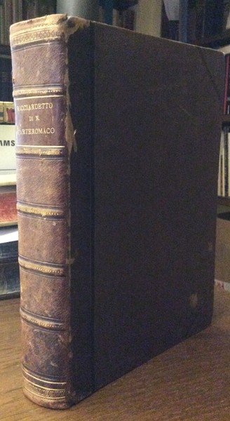 In-8 gr. (mm. 257 x 190), 2 parti in 1 vol., mz. pelle ottocentesca, dorso a cordoni (con abras.), fregi e titolo oro, pp. XXXVI,420; (2, occhietto),412; frontespizio in rosso e nero con una vignetta inc. in rame da F. Zucchi su disegno di Ghedini; ritratto dell'A. all'antiporta, inc. in rame da anonimo. Il vol. è pregevolmente ornato da 30 eleganti testate all'inizio di ogni canto, 30 iniziali figurate e 18 finalini, tutti inc. in rame da Zucchi, Pitteri e Cattini, su disegni di Ghedini. "Prima edizione postuma" del poema giocoso in ottava rima di Niccolò Forteguerri (1674-1735), in 30 canti, pubblicato col nome dell'autore grecizzato in Carteromaco.. Veramente egli non pensava di pubblicarlo. E sarebbe finito alle fiamme perché prima di morire egli bruciò tutti i suoi manoscritti. Fortuna volle che ne avesse dato una copia al Card. Bentivoglio, al cui nipote dobbiamo se "Il Ricciardetto" fu pubblicato nel 1738 dal Pitteri. Così Diz. Opere Bompiani,VI, p. 213.Cfr. Morazzoni, p. 220 - Parenti, p. 237 - Brunet,I,1604 - Gamba 2241: Edizione nitida e non mutila, come lo furono alcune delle posteriori - Melzi,I, p. 179: Fu ristampato altre volte, ora sotto il finto, ora sotto il vero nome dell'autore. Picc. macchia su 4 cc. nella I parte e lieve alone margin. sulle prime 15 cc. della II parte, altrimenti fresco esemplare ben conservato.