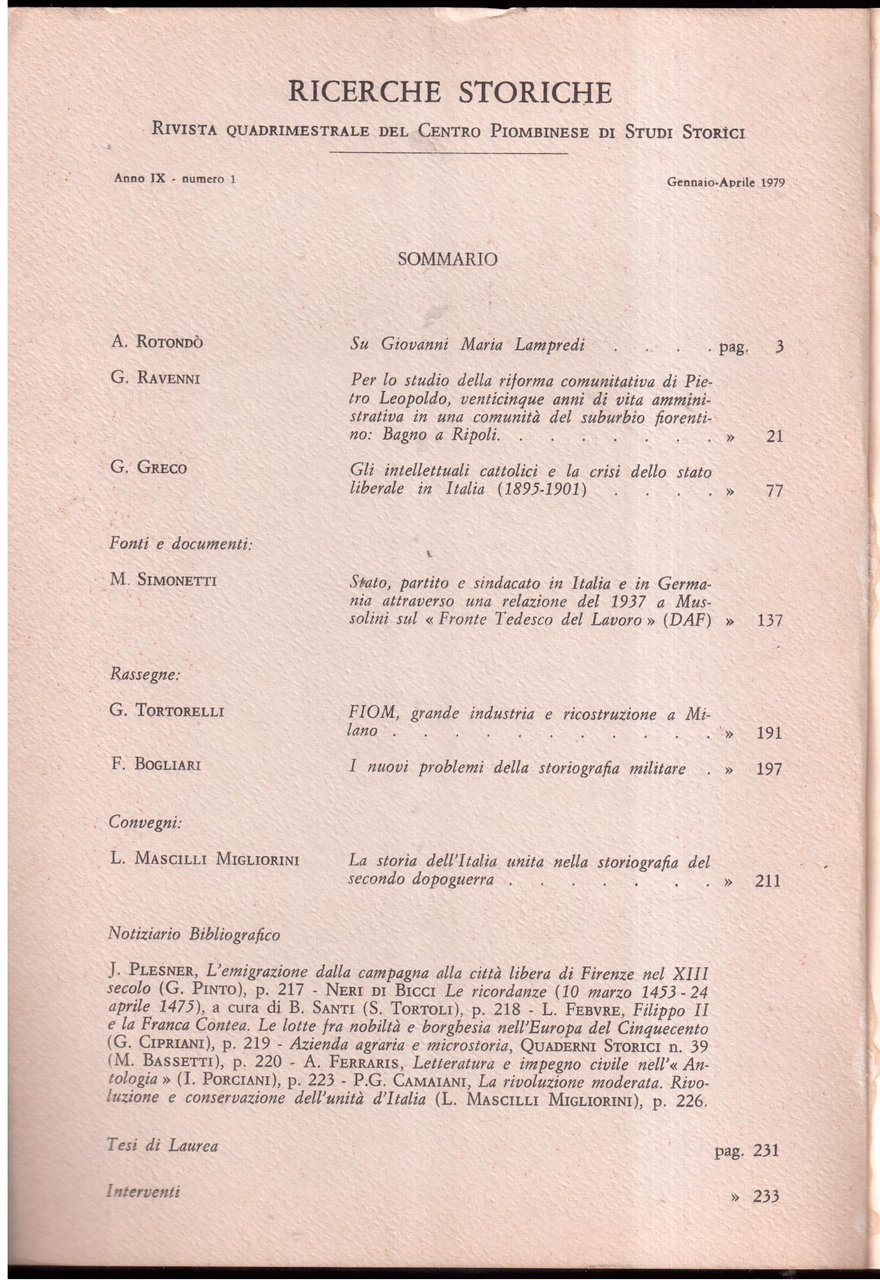 In 8°- bross. edit. illustrata- pp. 238- in ottimo stato.- Sommario: A. Rotondò ( Su giovanni Maria Lampredi ) - G. Ravenni ( Per lo studio della riforma comunitativa di Pietro Leopoldo, venticinque anni di vita amministrativa in una comunità del suburbio fiorentino: Bagno a Ripoli )- G. Greco ( Gli intellettuali cattolici e la crisi dello stato liberale in Italia 1895-1901 )- M. Simonetti ( Stato, partito e sindacato in Italia e in Germania attraverso una relazione del 1937 a Mussolini sul " Fronte tedesco del lavoro " )- G. Tortorelli ( FIOM, grande industria e ricostruzione a Milano )- F. Bogliari ( I nuovi problemi della storiografia militare ) - L. Mascilli Migliorini ( La storia dell'Italia unita nella storiografia dedl secondo dopoguerra ).
