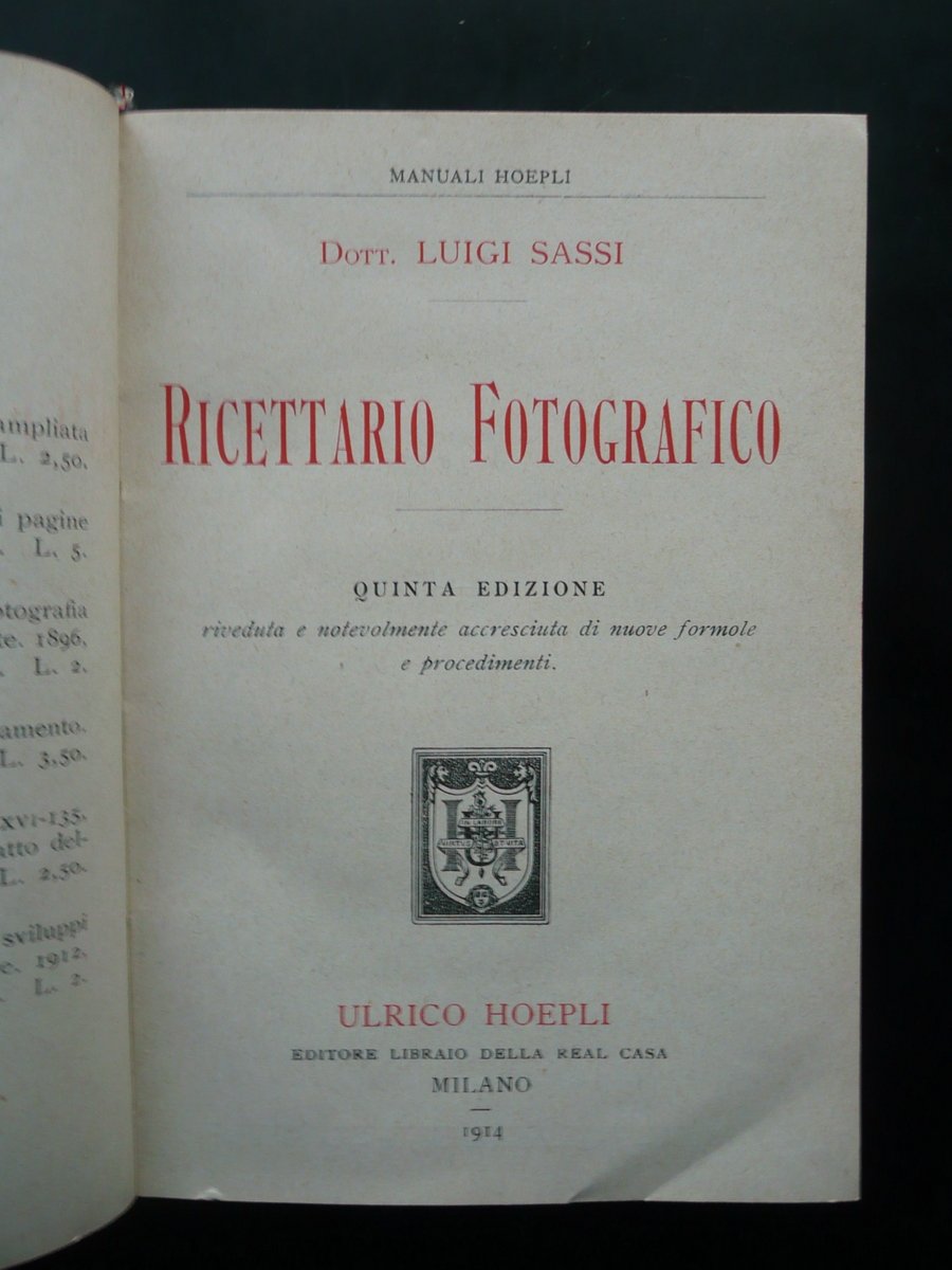 Ricettario Fotografico Luigi Sassi Hoepli Milano 1914 5∞Edizione Fotografia