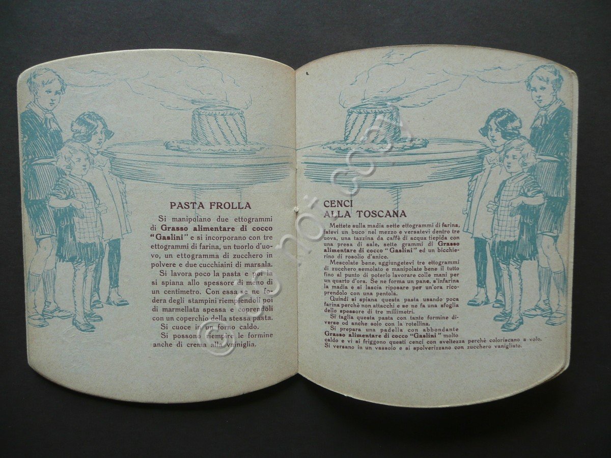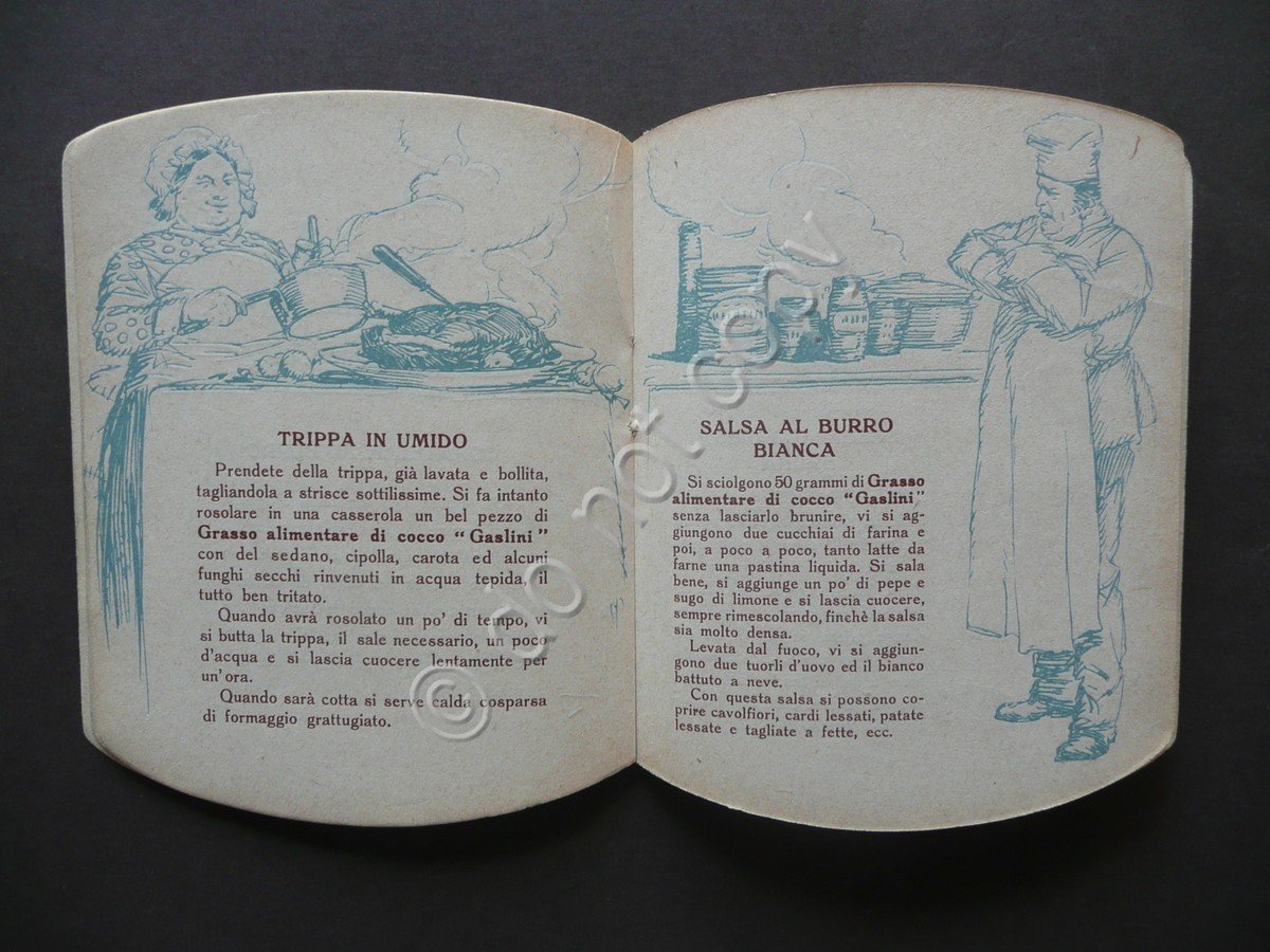 Pubblicità - ricettario, Gaslini" società anonima sede in Milano Spremitura e Raffineria d'Oli Vegetali stabilimenti in Bolzaneto Turati Lombardi e C., Milano, s.d. (anni '50 / '60 del Novecento circa), pubblicità - ricettario dell'Azienda Gaslini di Milano, pp. non num. (pp. 30), ciascuna con una ill. in monocromia; brossura ed. a col. sagomata a forma di barattolo. Cm 13x10. Condizioni di conservazione Esemplare in buone condizioni con tracce d'uso, brossura con pochi trascurabili difetti, dorso con lievi abrasioni dovute all'utilizzo. Interni buoni. Curiosa pubblicità - ricettario dell'Azienda Gaslini di Milano. Brossura illustrata a colori e sagomata a forma di barattolo (vedi foto). SC03.D9643 N "