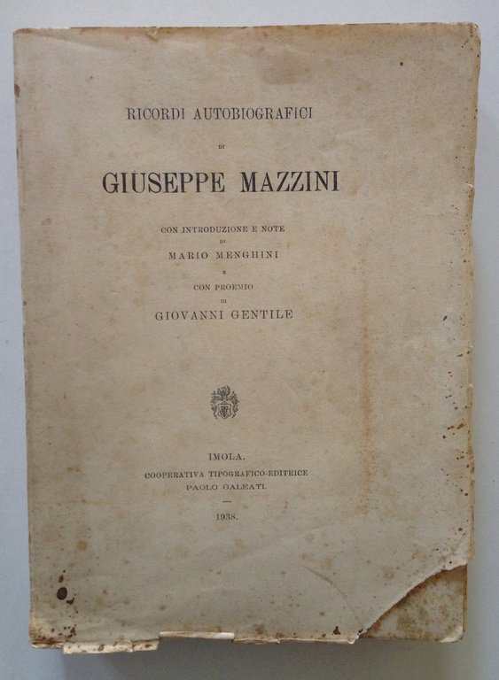 Giuseppe Mazzini, Ricordi autobiografici di Giuseppe Mazzini Coop. Tipografico-Editrice Galeati, Imola 1938, cm. 22.5x16.5, pp. 397; con introduzione e note di Mario Menghini e con proemio di Giovanni Gentile; br. ed. Condizioni di conservazione Esemplare in buono stato con leggere tracce d'uso; brossura ditoriale con bruniture e con minime pieghette e strappetti ai margini, agli angoli e al dorso; brossura anteriore con una mancanza all'angolo inferiore; brossura posteriore con una gora al margine superiore che interessa anche parte del dorso e con una traccia di piega in diagonale (vedi foto); interni buoni intonsi con qualche fioritura. SETT128.L12628 MT