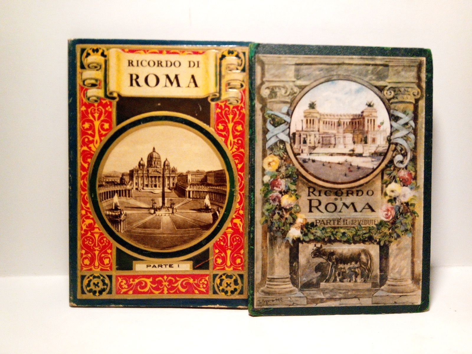 [S.l., Roma?]: [s.n.], [ca. 1923].- 2 Vols. ([32 h.]; [32 h.] en formato desplegable): Son fotografías en negro con vistas de Roma, con su explicación en tres idiomas al verso de cada foto (italiano, francés e inglés); 8º menor (16,8 x 11,7cm); Cartoné Ed. ilustrado a todo color, con un plano de la ciudad en la cara interna de las cubiertas del primer tomo.- RARO.* Pequeñas rozaduras en las esquinas. Por lo demás muy bien. GEOGRAFÍA, GUÍAS Y ATLAS DEL EXTRANJERO
