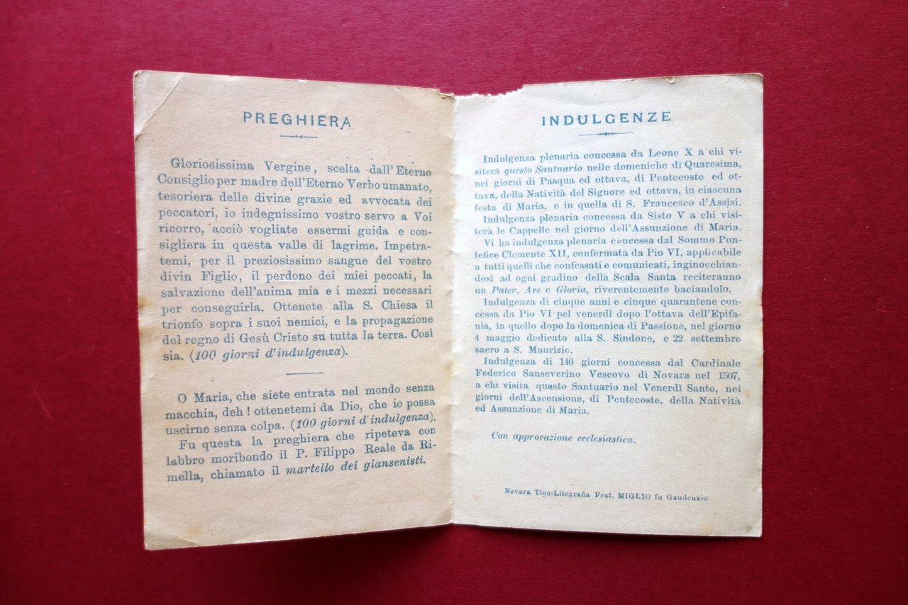 Brossura ricordo, Ricordo del Sacro Monte di Varallo Valsesia Tipo-Lit. Frat. Miglio, Novara, s. d. (primi anni del '900 circa); brossura - ricordo (pp. 4 non num.) a stampa su carta, con bella grafica cromolitografica. Cm 11,5x15,5 (aperta). Condizioni di conservazione Esemplare in buone condizioni con una minima marginale mancanza alla parte superiore, angoli con minuscoli difetti e leggerissime tracce di pieghette; al lato interno minimi accenni di ingiallimento. SC03.D16438 N