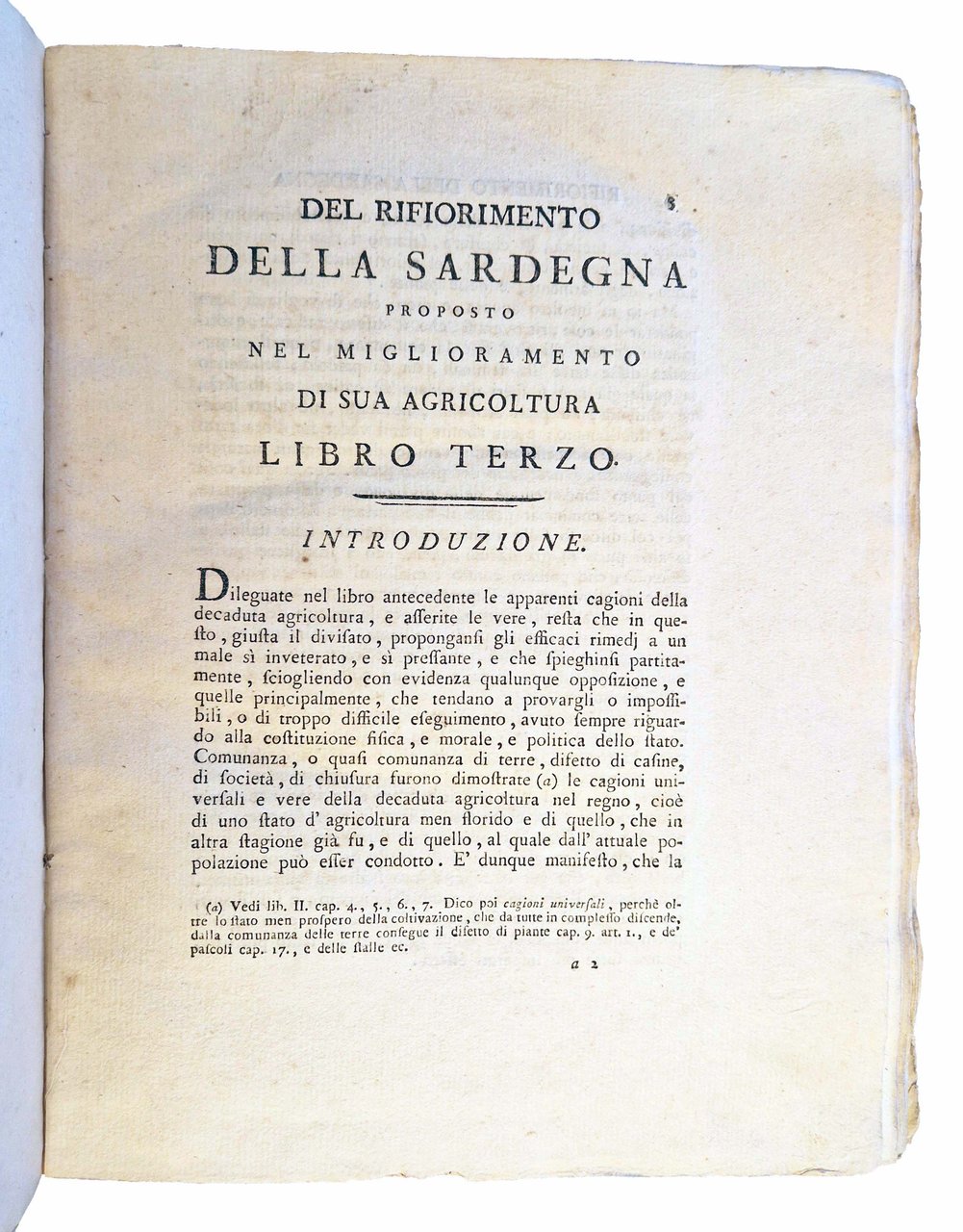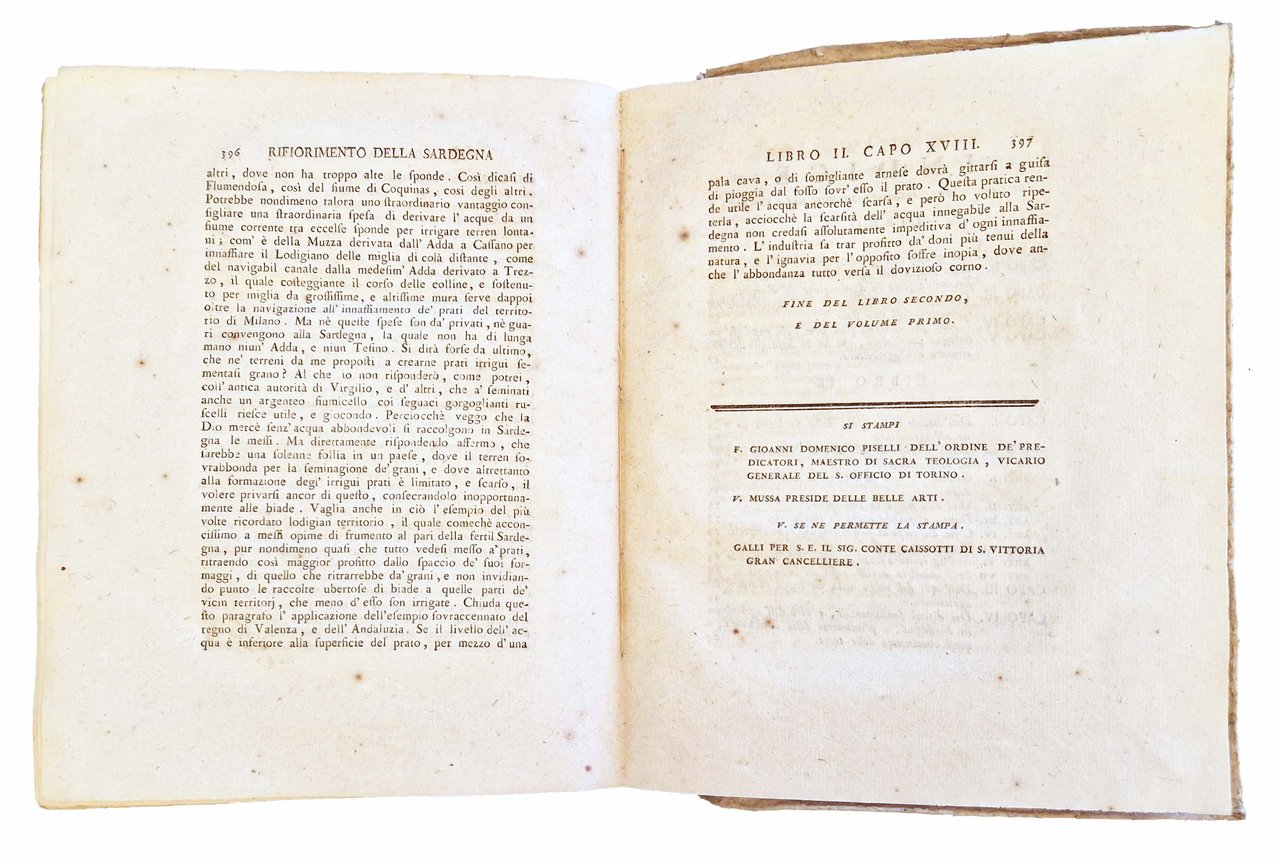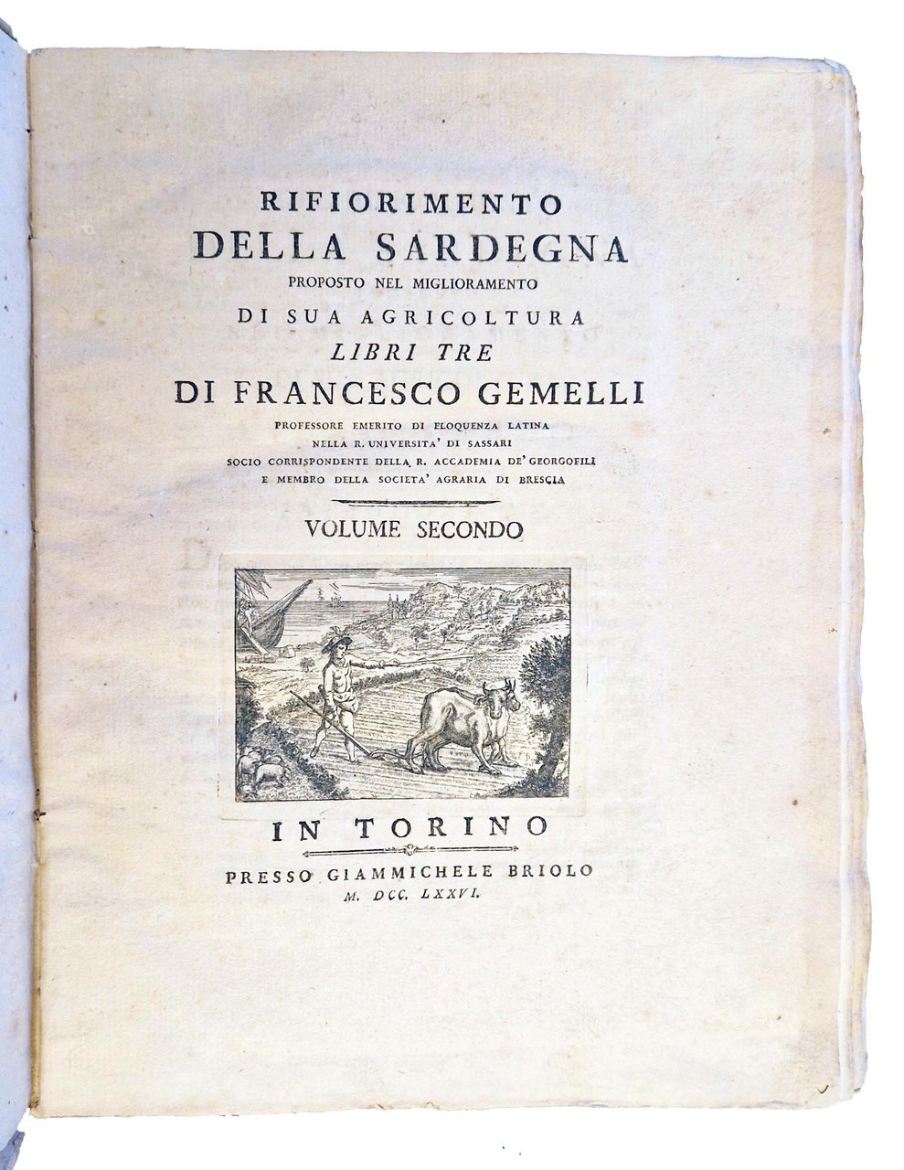 in-4°, 244x188 mm, leg. in cartonato grezzo muto coevo, con titolo al dorso; pp. XVI, 397, [3]; 342, [2]. Frontespizio stampato in rosso e nero, con vignetta calcografica rappresentante un uomo che ara la terra. Prima edizione di questo interessante studio, a cura del professore gesuita Francesco Gemelli Careri, sulla storia dell'agricoltura sarda dai tempi dei romani; analizza le problematiche della pastorizia e prospetta interventi di modernizzazione, con particolare riguardo alla coltura degli ulivi; contiene anche notizie storiche e folcloristiche sulla regione. Rif.: IT\ICCU\TO0E\025127. OCLC, 265524639. Cond.: segni d'uso alla legatura; carte croccanti e marginose, con presenza di fioriture; nel complesso trattasi di un buon esemplare.