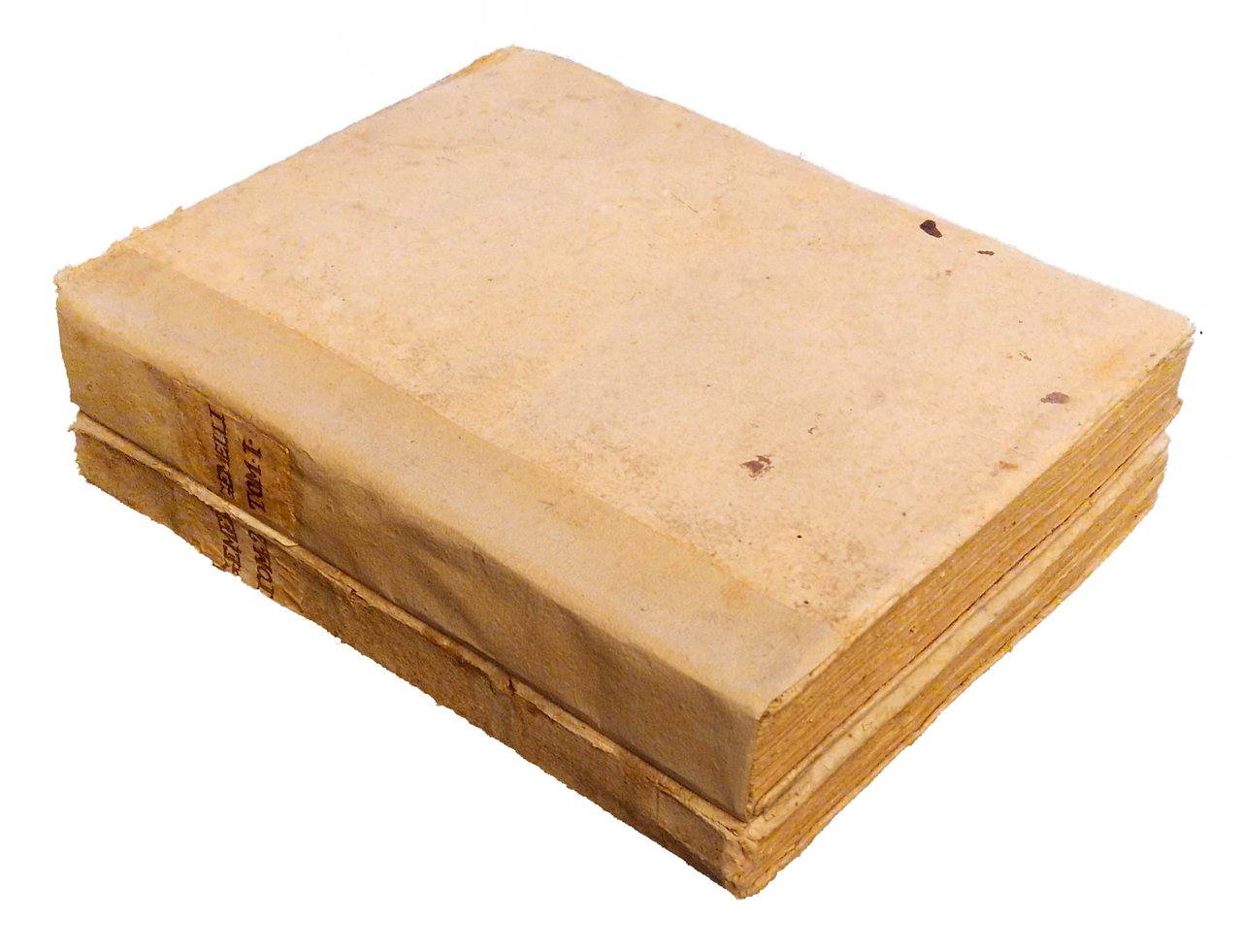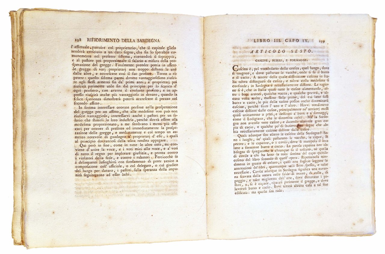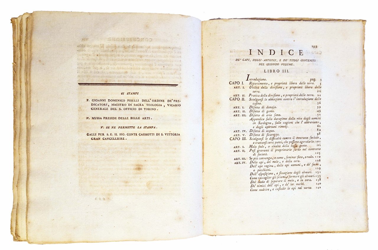 in-4°, 244x188 mm, leg. in cartonato grezzo muto coevo, con titolo al dorso; pp. XVI, 397, [3]; 342, [2]. Frontespizio stampato in rosso e nero, con vignetta calcografica rappresentante un uomo che ara la terra. Prima edizione di questo interessante studio, a cura del professore gesuita Francesco Gemelli Careri, sulla storia dell'agricoltura sarda dai tempi dei romani; analizza le problematiche della pastorizia e prospetta interventi di modernizzazione, con particolare riguardo alla coltura degli ulivi; contiene anche notizie storiche e folcloristiche sulla regione. Rif.: IT\ICCU\TO0E\025127. OCLC, 265524639. Cond.: segni d'uso alla legatura; carte croccanti e marginose, con presenza di fioriture; nel complesso trattasi di un buon esemplare.