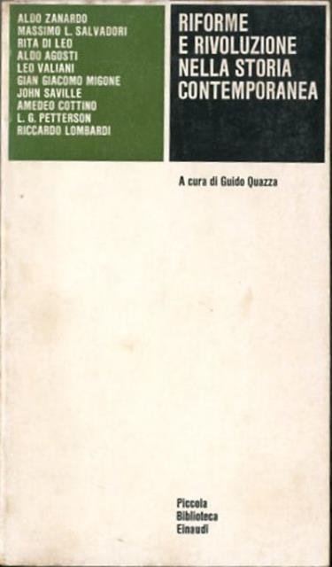 VIII, 342 p. ; 18 x 11 cm. Piccola biblioteca Einaudi. Geografia, storia. I contributi di questo libro sono il frutto di un seminario dell'Università di Torino, centrati intorno al rapporto riforme e rivoluzione nell'opera di Marx e Engels, nella socialdemocrazia tedesca, nel bolscevismo, nella Terza Internazionale, in Austria e in Ungheria, negli Stati Uniti, in Inghilterra, in Svezia, nel mondo del dopoguerra. Contributi di: Aldo Zanardo, Massimo L. Salvadori, Rita Di Leo, Aldo Agosti, Leo Valiani, Gian Giacomo Migone, John Saville, Amedeo Cottino, L.G. Petterson, Riccardo Lombardi. Brossura editoriale, coperta in cartoncino flessibile colorato (b/n e verde). Quale lieve segno del tempo alla coperta, interno in buono stato. Codice libreria 1573.