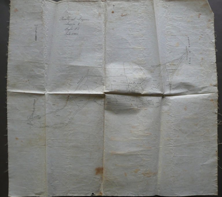 Rilievo cartografico, Pavullo nel Frignano - La Torre - scala 1:2000 Pavullo nel Frignano, s.d., ma fine 1800; 46,5x49,3 cm. rip. pi√π volte, rilievo cartografico eseguito a mano su tela, con alcune note di calcoli segnati a matita al retro. Condizioni di conservazione Esemplare in buone condizioni con piccoli strappetti e slabbrature d'uso lungo i margini, pieghe agli angoli, alcune macchie e ingialliture alla mappa, bruniture e alcune macchiette d'uso anche al retro, normali pieghe di conservazione. SC03.D4566 MT