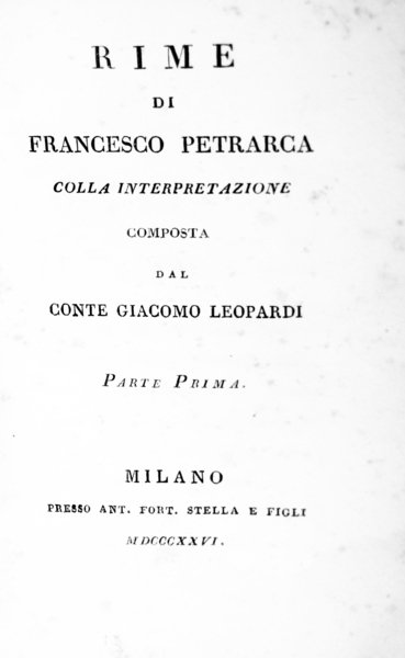 In-16 p. (mm. 152x92), 2 parti in 2 volumi, cartonato moderno, titolo oro su tassello al dorso. - Parte prima, pp. 501, inclusi: frontespizio, avviso de gli Editori, un proemio de l'Autore della interpretazione a chi legge (è anonimo); segue il testo del canzoniere petrarchesco Sonetti e canzoni in vita di Madonna Laura, con le note del Leopardi.- Parte seconda, pp. 971 (numeraz. continua), segue il rimanente del canzoniere Sonetti e canzoni in morte di Madonna Laura, un Indice delle Rime cioè sonetti, canzoni, sestine, ballate, madrigali e trionfi sino alla p. 968. Nelle 3 seguenti v'è una scusa dell'interprete.Cfr. Mazzatinti / Menghini Bibliografia leopardiana,I, n. 658 - Cappelletti Bibl. leopardiana, p. 25: l'edizione principale è Milano, Stella, 1826.Con fioriture e aloni, ma complessivam. buon esemplare, con barbe.