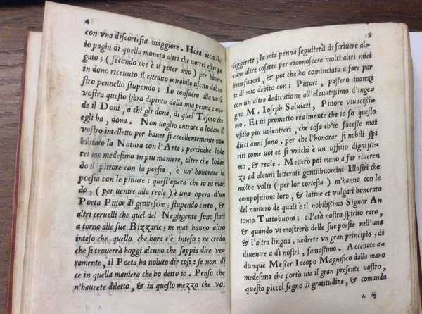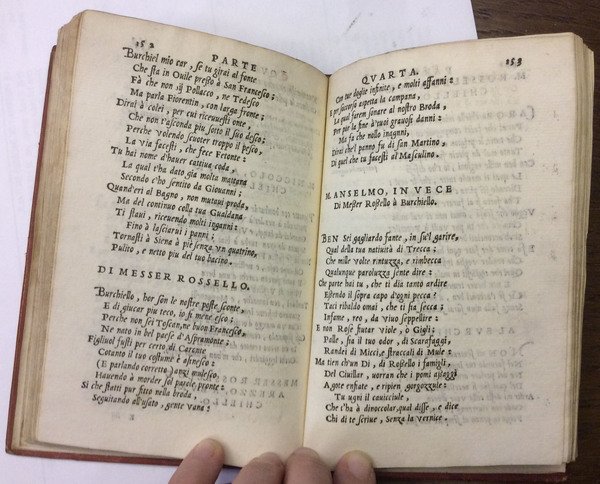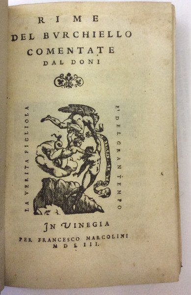In-16 p. (mm. 155x95), p. pelle ottocentesca, dorso a cordoni (restaur.) con decoraz. a secco e titolo oro, pp.num. 209,(1), 7 cc.nn., incluso il frontespizio con marca tipografica; avanti le rime e al fine del vol. si trova replicato un bel ritratto del Burchiello silografato a p. pag. con l'epigrafe Il Burchiello poeta Fiorentino; altra marca al recto dell'ultima carta. "Prima edizione con il commento del Doni".Cfr. Brunet,I,1400: Le commentaire du Doni donne prix à cette édition où se trouve une épitre du commentateur à "Jacopo Tintoretto pittore unico" - Gamba,1371 - Short-Title Cat. British Library, p. 223 - Manca all'Adams che cita un'ediz. del 1597.Le poesie di Domenico di Giovanni, detto il Burchiello (1404-1440) non sono soltanto un oggetto di curiosità erudita o una piacevole lettura per chi ama le facezie, ma presentano un interesse più vasto sia come documento di un gusto non spentosi con l'età dell'autore, sia per quel che è in esse di veramente poetico. Una vena di autentica poesia era infatti in quel barbiere fiorentino, che conobbe malanni, vizi e miserie, e la cui bottega fu un circolo di letterati, semi-letterati e capiscarichi e una fucina di critiche mordaci e di beffe. Così Diz. Opere Bompiani, VI, 262.Qualche lieve alone ma certamente un buon esemplare.