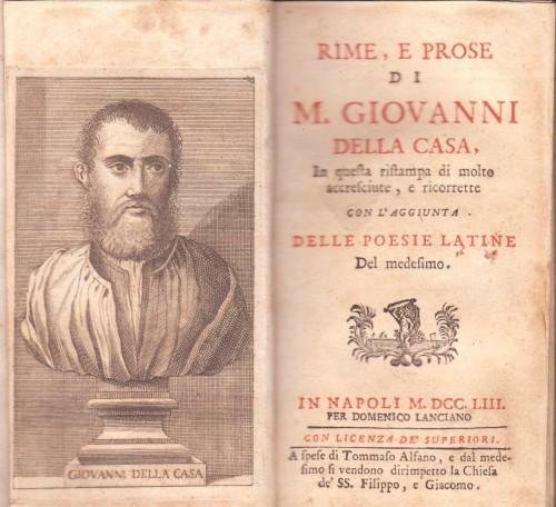 in 12° (cm. 16x8,8), pp. 8 nn., 279, 1; p/perg. coeva su assi in legno, tit. in oro al ds., ritratto dell'A. inc. all'antip., front. in rosso e nero con vignetta; l'opera comprende anche la Vita (scritta da Filippo Bulifon), il Trattato del Galateo, il Trattato degli Uffici Comuni e l'Orazione a Carlo V Imperatore per la città di Piacenza; lievi arrossamenti diffusi dovute al tipo di carta, antico rinforzo al 1° fascicolo, ma ottima copia in solida legatura. 463/23