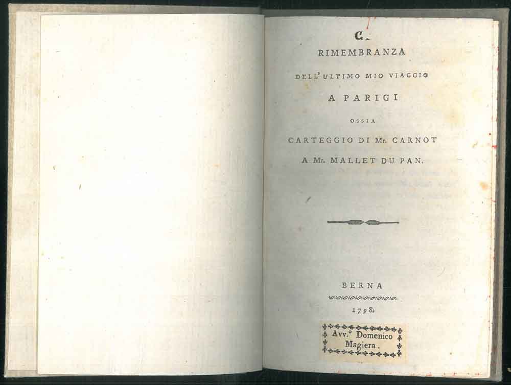 Rimembranza dell'ultimo mio viaggio a Parigi ossia carteggio di Mr. Carnot a Mr. Mallet du Pan