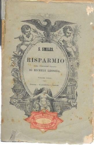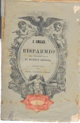 in 8°, pp. XXIII, 410, bross. edit. ill. Prima traduz. ital. di Michele Lessona, 5^ ediz.; tutto sul risparmio con esempi di uomini illustri. Piccole mancanze alla bross., rinforzo al ds. e qc. fior. 601/36