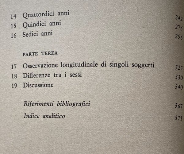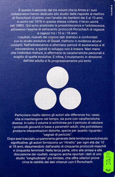È questo il secondo dei tre volumi che la Ames e i suoi collaboratori hanno dedicato allo studio delle risposte al reattivo di Rorschach (il primo, con l'analisi dei bambini dai 2 ai 10 anni, è uscito nel 1978 in questa stessa collana; il terzo uscirà nel 1980). Qui sono analizzate la preadolescenza e l'adolescenza, attraverso l'esame di settecento protocolli Rorschach di ragazze e ragazzi tra i 10 ei 16 anni. I risultati, ricavati dai copiosi dati statistici e confrontati con lo studio evolutivo di Gesell, mettono in evidenza alcune costanti Nell'adolescenza si alternano periodi di esuberanza e di introversione, e quindi lo sviluppo non è lineare. Man mano che l'individuo matura, si affermano le caratteristiche personali a scapito di quelle evolutive. E infine, il mutamento in direzione dell'età adulta si fa progressivamente più lento.