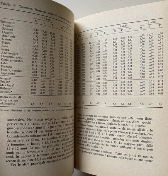 Soggetti: Psicologia applicata, Test, Valutazioni psicologiche, Interpretazione, Manuali, Teorie, Filosofia, Metodologia, Libri universitari, Anni Settanta, Classici, Bambini, Ragazzi, Ragazze, Adolescenti, Giovani, Disturbi psichici, Differenze di genere, Risposte, Conclusioni, Diagnosi, Diagnostica, Bambino, Adolescente, Anziano, Classi di età, Ricerca, Studi, Clinica, Casi studio, Sigmund Freud, Sogni, Attività onirica, Figure, Simboli, Simbolismo, Sessualità, Identità, Psicosi, Nevrosi, Terapia, Sviluppo psichico, Gesell, Letteratura, Gruppi contrapposti, Pubertà, Nevrosi, Ansia, Angoscia, Delinquenza minorile, Insuccesso scolastico, Analisi, Comportamento, Personalità, Nevrotici, Isteria, Cox, Goldfarb, Tecniche proiettive, Transfert, Linguaggio, Crescita, Immagini, Figure, Colori, Traumi infantili, Infanzia, Soggetti, Tavole, Reazioni, Dieci anni, Undici anni, Dodici anni, Tredici anni, Quattordici anni, Quindici anni, Sedici anni, Sessi, Maschi, Femmine, Bibliografia, Riferimento, Consultazione, Libri Vintage fuori catalogo online, Scuola, Reattivo, Rappresentazione simbolica, Risposta cenestesica, Furrer, Sublimazione, Binder, Meccanismi di difesa, Paura, Pericolo, Autostima, Delirio, Narcisismo, Egocentrismo, Frustrazione, Disagio, Winnicott, Rapaport, Piaget, Pensiero, Cambiamenti, Corpo, Trasformazioni, Identità, Percezione, Attrazione, Desiderio, Pulsioni, Affettività, Relazioni, Ambiente sociale, Sviluppo affettivo, Famiglia, Genitori, Norme, Disturbi mentali, Ripetizione, Compulsione, Attendibilità, Patologie, Affermazioni, Prevedibilità, Adulti, Marguerite Hertz, Soggetti, Shock, Ames, Jessie Francis Williams, Rifiuto, Negazione, Protocolli, Punteggi individuali, Regole, Schemi, Collera, Ira, Aggressività, Sottomissione, Capricci, Sangue, Fango, Arte, Fantasmi, Statue, Rosso, Movimento, Aggettivi, Fiori, Piante, Natura, Animali, Farfalla, Maschera, Fuoco, Riflesso, Astratto, Pittura, Disegno, Gesti, Giocare, Disturbi alimentari, Mangiare, Conflitti, Relazioni, Statistiche, Pescor, Uniformità, Tristezza, Risonanza, Flusso di coscienza, Cibo, Diavolo, Clob, Dati, Aspettative, Adattamento, Segni, Semantica, Psicanalisi, Applied psychology, Psychological evaluations, Interpretation, Manuals, Theories, Philosophy, Methodology, University books, Seventies, Classics, Children, Boys, Girls, Adolescents, Young people, Psychic disorders, Gender differences, Answers, Conclusions, Diagnosis, Diagnostics, Child, Teenager, Elderly, Age classes, Research, Studies, Clinic, Case studies, Dreams, Dream activity, Figures, Symbols, Symbolism, Sexuality, Identity, Psychosis, Neurosis, Therapy, Psychic development, Literature, Contrasting groups, Puberty, Neurosis Anxiety, Anguish, Juvenile delinquency, School failure, Analysis, Behavior, Personality, Neurotic, Hysteria, Projective techniques, Language, Growth, Pictures, Figures, Colors, Childhood trauma, Subjects, Tables, Reactions, Ten, Eleven, Twelve, Thirteen, Fourteen, Fifteen, Sixteen years, Sexes, Males, Females, Bibliography, Reference, Consultation, Out of print books online, School, Reactive, Symbolic representation, Coenesthetic response, Sublimation, Defense mechanisms, Fear, Danger, Self-esteem, Delirium, Narcissism, Egocentrism, Frustration, Discomfort, Thought, Changes, Body, Transformations, Identity, Perception, Attraction, Desire, Drives, Affection, Relations, Social environment, Affective development, Family, Parents, Norms, Mental disorders, Repetition, Compulsion, Trustworthiness, Pathologies, Affirmations, Predictability, Adults, Rejection, Denial, Protocols, Individual scores, Rules, Patterns, Anger, Aggression, Submission, Whims, Blood, Mud, Ghosts, Statues, Red, Movement, Adjectives, Flowers, Plants, Nature, Animals, Butterfly, Mask, Fire, Reflection, Abstract, Painting, Drawing, Gestures, Play, Eating disorders, Eating, Conflicts, Relationships, Statistics, Pescor, Uniformity, Sadness, Resonance, Flow of consciousness, Food, Devil, Data, Expectations, Adaptation, Signs, Semantics, Psychoanalysis