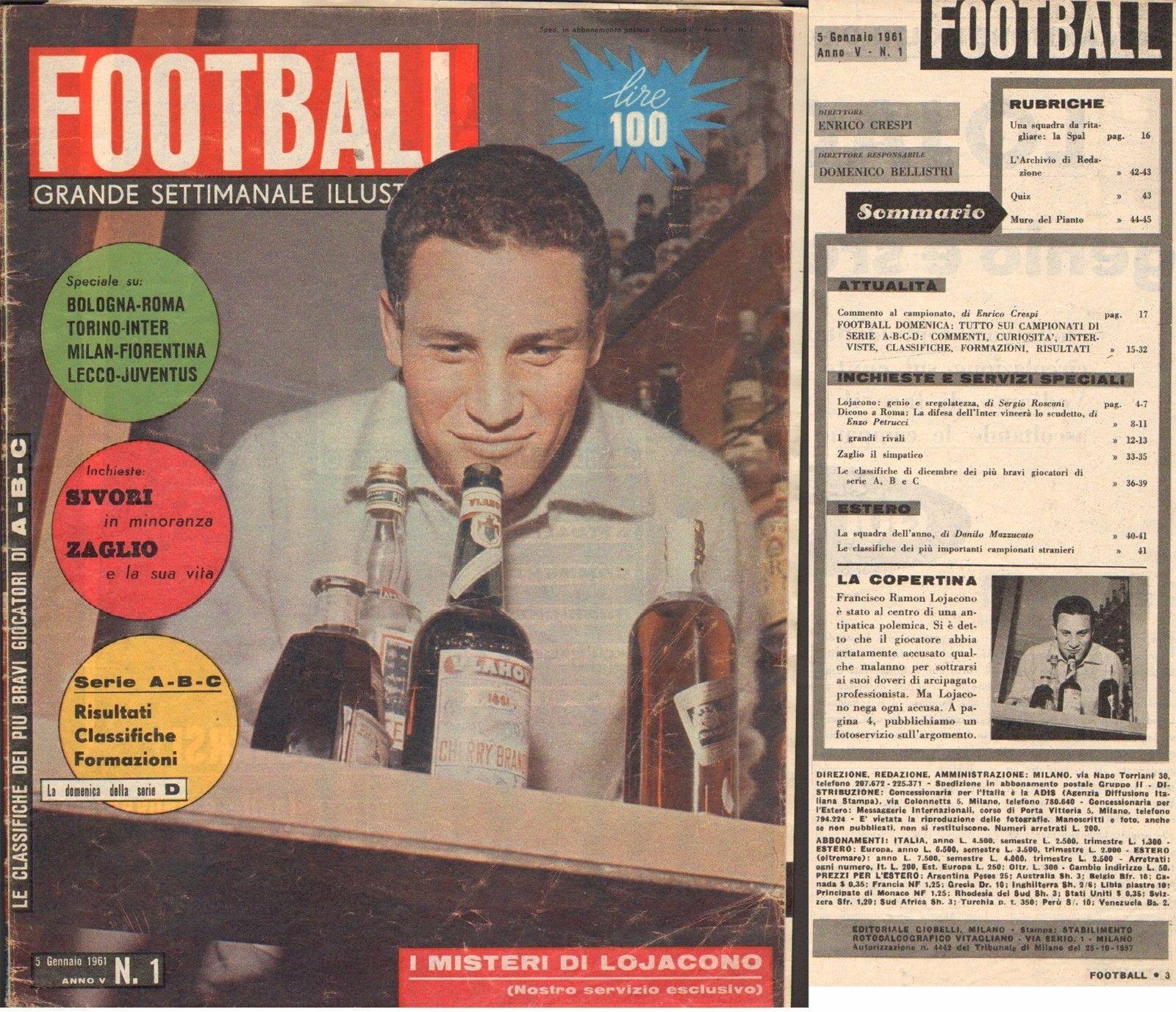FOOTBALL GRANDE SETTIMANALE ILLUSTRATO. 5 GENNAIO 1961, CON MOLTISSIME IMMAGINI E SERVIZI DELLE SQUADRE DELL'EPOCA, PP. 46. ARTICOLI SU SIVORI, ZAGLIO, LOJACONO ALL'INTERNO LA SQUADRA DELLA SPAL A COLORI ECC. L 4502