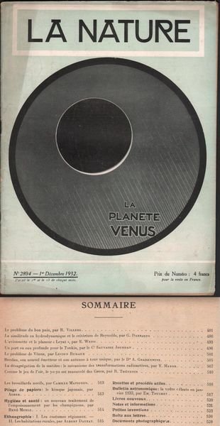 LA NATURE-LA PLANETE VENUS-N∞ 2894-1 DECEMBRE 1932. PP. 48†PIŸ' PP. 8 DI†PUBBLICIT¿. CM. 29 X 22. BELLA RIVISTA DI INIZIO SECOLO, TRATTA DI INVENZIONI TECNOLOGICHE, AEREONAUTICA, ARCHEOLOGIA, ASTRONOMIA E MOLTI ALTRI ARGOMENTI. RARA. BUONE CONDIZIONI COPERTINA CON QUALCHE FIORITURA QUALCHE MACCHIA ALL'INTERNO, COPERTINA STACCATA CON STRAPPI MARGINALI