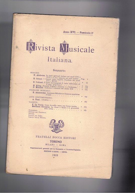 Rivista musicale italiana, trimestrale, anno XVI del 1909. Le laudi spirituali nei secoli XVI e XVII e il loro rapporto coi canti profani; anciennnes melodies et chansons populaire d'Italie; Giulio Stckhausen e la scuola del canto artistico; musica popolare sarda; notice sur Méhul par Cherubini; ecc.