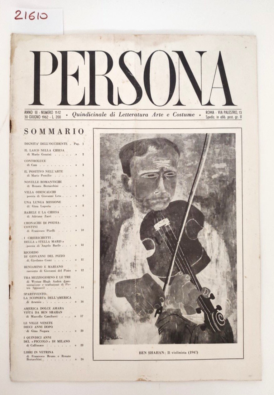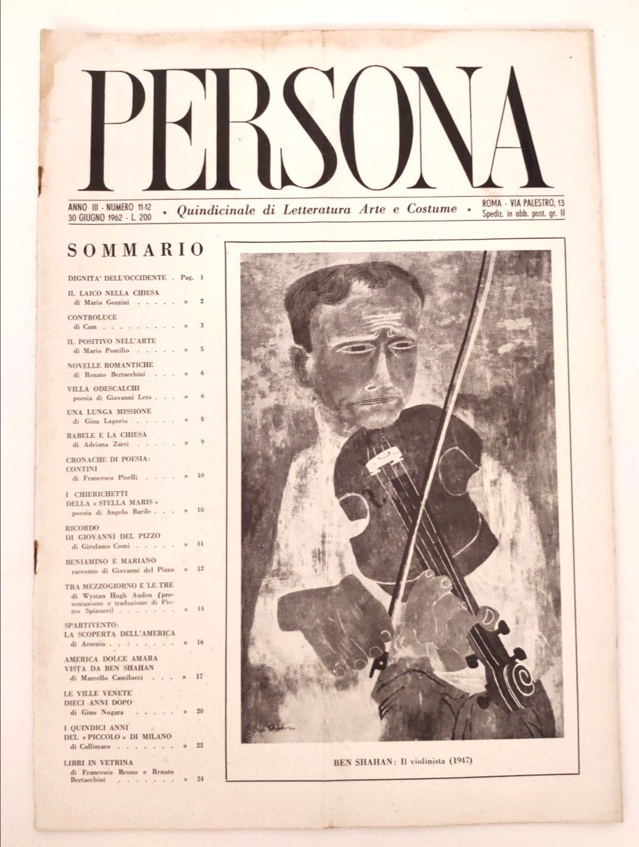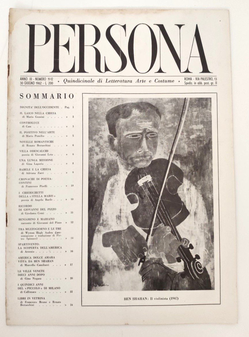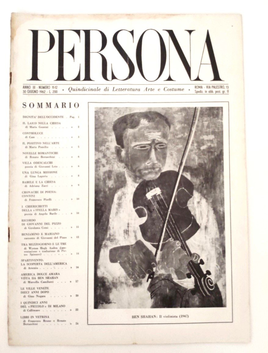 L'illustrazione in copertina è di Ben Shahn, intitolata "Il violinista (1947)". in condizioni accettabili, con alcuni segni di usura, bruniture ai margini, una piega longitudinale che interessa tutta la rivista piccole pieghe agli angoli, graffa di legatura arrugginita